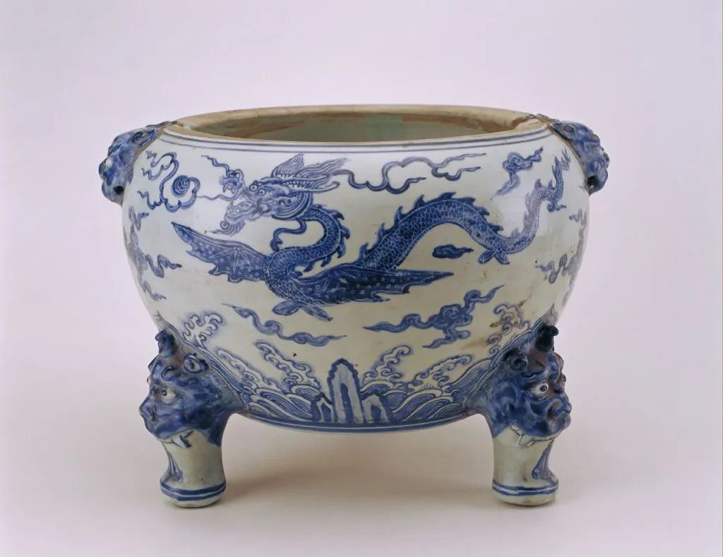 圆腹,3兽形足,腹部有对称两兽头耳,耳上部残缺。腹部青花绘有3条飞翔于云海之中的应龙,颇有气势。炉内与3足对应处有3个大钮。器底有一圆孔。