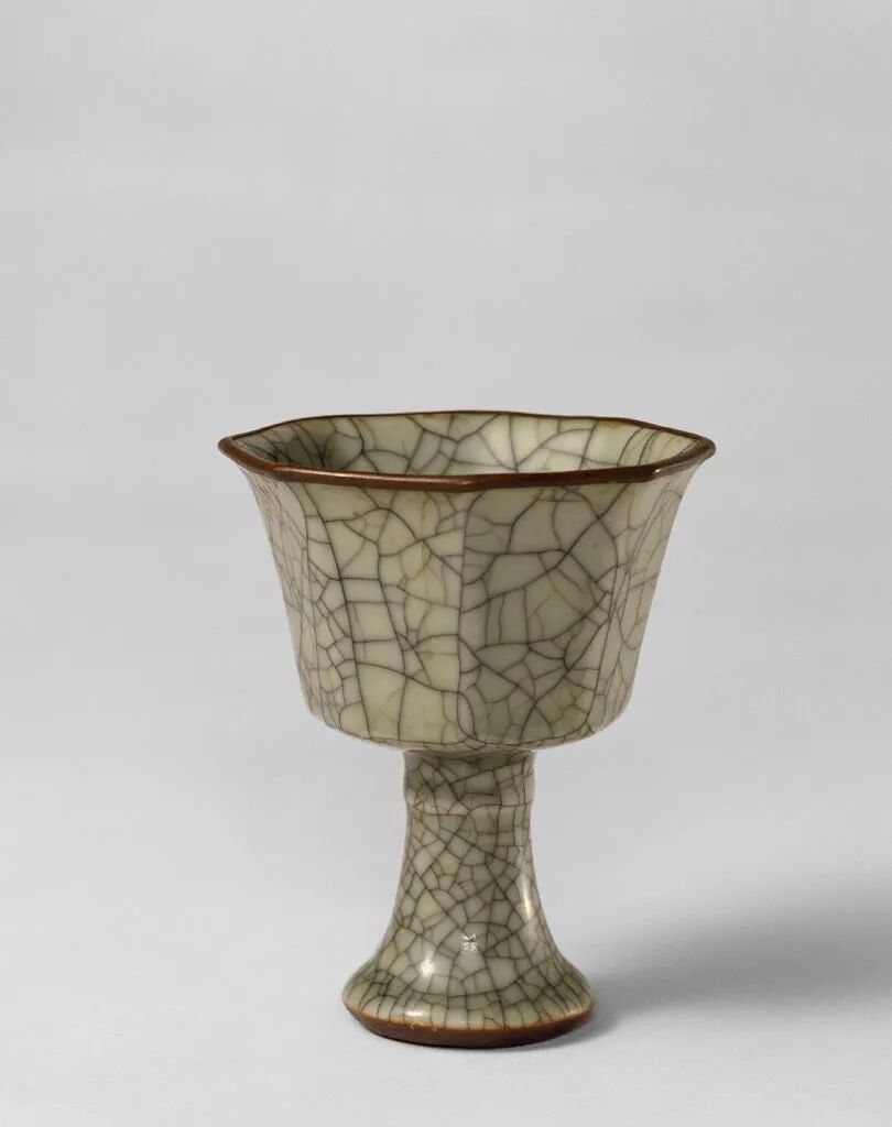 明代景德镇仿宋代哥窑瓷器始于宣德时期,此时,景德镇除烧制传统品种外,还创烧了许多新品种,仿哥窑瓷是其中之一。成化时期继承前制,并形成了自己的时代风尚。这件仿哥窑八方高足杯为成化时期新创品种,其形制玲珑俊秀,装饰典雅精美,富有成化器的特色。釉面虽仿宋代哥釉,但其釉质肥润,平整光亮,光泽度较强,故无宋哥窑的“酥润含蓄”之美。口、足釉色及金丝铁线纹也较宋哥窑片纹规整,少天成之趣。