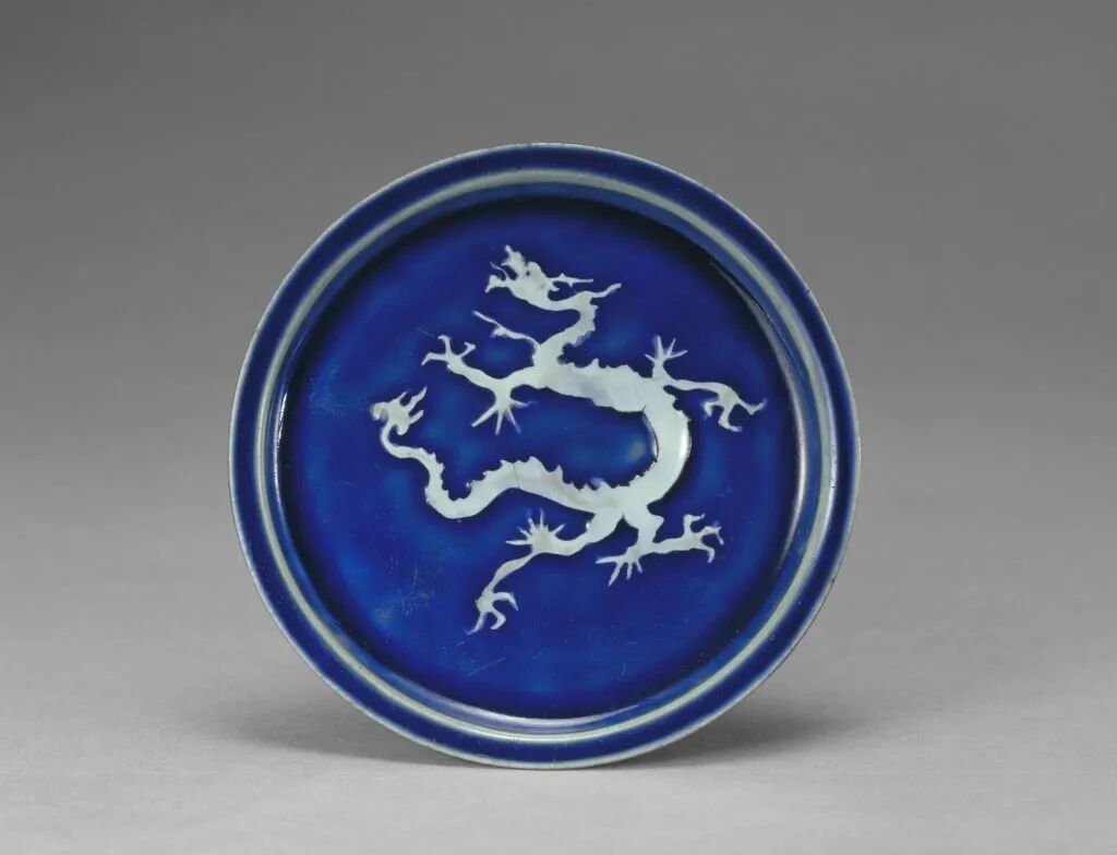 此盘属于高温钴蓝釉瓷器。这种传世元代蓝釉白龙纹盘见诸发表的共有4件,除故宫博物院收藏的这一件以外,日本出光美术馆、大阪市立东洋陶瓷美术馆和英国伦敦大维德基金会各收藏1件。
