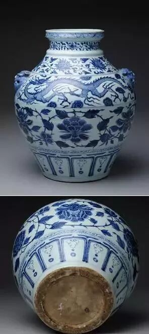 这件大罐的纹饰与上面故宫馆藏的纹饰,异曲同工:上半部是龙,下半部画牡丹。初感觉不是很协调,但视觉冲击力很强,这一类器物很独特。元朝人的粗线条性格,展露无遗。