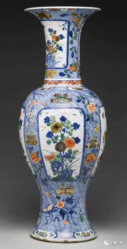 另外一种也是先在坯体用青花料画花鸟半体或者是局部,但是其余的部分不用青花料双钩轮廓线,经过施釉烧成以后再在釉上以没骨画法或者是钩线填彩画法,用釉上彩凑成图案的全体,这又是一种途径。嘉靖、隆庆、万历时期的青花五彩瓷器使用的就是这种工艺技法。![]()