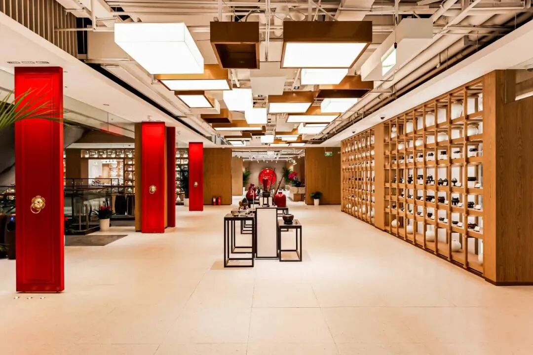 在升级改造后,巨大的落地窗取代了传统橱窗,琳琅满目的文玩艺术品一览无余。开放式的陈列展柜一改传统博古架带来的压抑沉重之感,原木色色调、留白的空间均营造出高颜值的赏玩氛围,穿行其间是一种绝佳的体验。