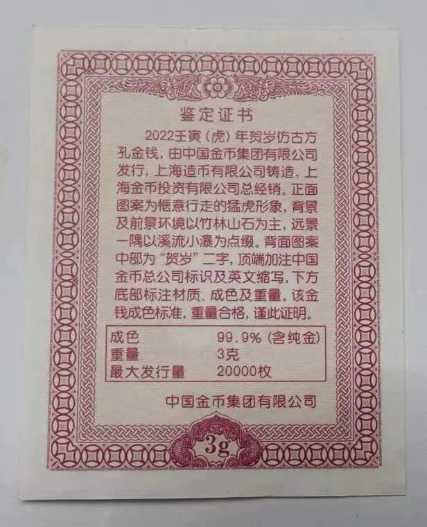 生肖系列的贺岁仿古金钱是从2003年开始发行,至今已有19年,2022虎年金钱属于第二轮仿古金钱。而且还是3克小规格,总价低,入手无压力。