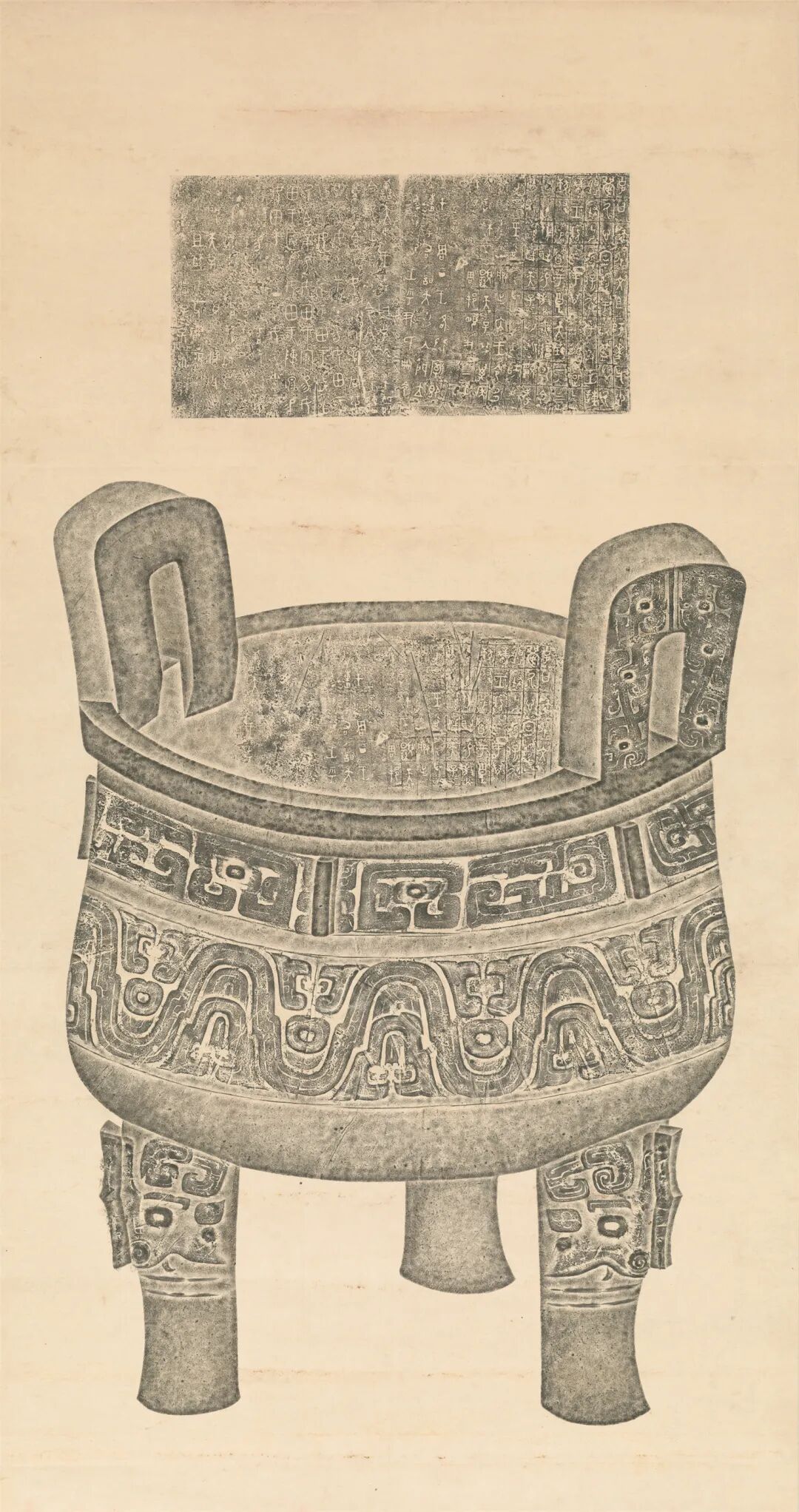 拓片是将碑文石刻、青铜器等文物的形状及其上铸刻的文字、图案拓印在宣纸上形成的,是传统金石学对青铜器和碑刻进行研究的重要资料。其朴拙典雅的古风,亦为世人所推崇,成为一种格调颇高的艺术品,历代金石学者和文人雅士竞相收藏鉴赏,蔚然成风。因此,拓片并不仅仅是文物的附属品,其本身亦是珍贵的文物。中国国家博物馆收藏的大盂鼎、大克鼎、毛公鼎铭文拓片及全形拓,是被称为“海内三宝”的三尊国之重器在不同历史时期面貌的见证。