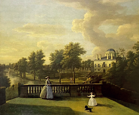 于是园林,似乎有了几分烟火气,几分生活的模样。它被寄予了文人诗意的期待,也反映了生活现实的无奈。艺术史家肯尼斯· 克拉克曾称,英式自然风景园林与莎士比亚和乡村别墅一起,是英国给世界最大的艺术贡献。英国独特的自然式园林无论在形式上还是观念上,都与欧陆地区的规则式园林迥然相异,耐人寻味。乔治· 兰伯特,《从瀑布上的阳台眺望奇兹威克庄园》,油画,1742 年,查茨沃斯协会藏流行于18世纪英国的“大旅行”促使年轻的艺术家与年轻的赞助人,离开家乡,他们在文化的浪潮中寻找属于这个国家与时代的风格。伯林顿是当时“大旅行”背景下年轻英国贵族的佼佼者,也具备这一群体的典型特征:年轻的辉格党人,心怀复兴英国社会和文化的抱负;慷慨的赞助人,除了从欧陆带回大量的艺术品之外,还赞助了一批优秀的艺术家。他在自己精心设计的帕拉第奥式府邸——奇兹威克,建立了一个以自己为中心的具有强大影响力的文艺圈子“伯林顿文人圈”。18 世纪早期英国文学进入了一个黄金时期,也就是所谓的“奥古斯都时期”,自然观念就是在这一时期的新古典主义文学中逐步发展起来。