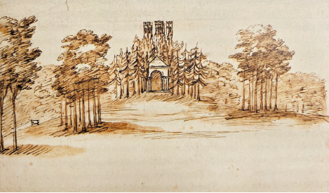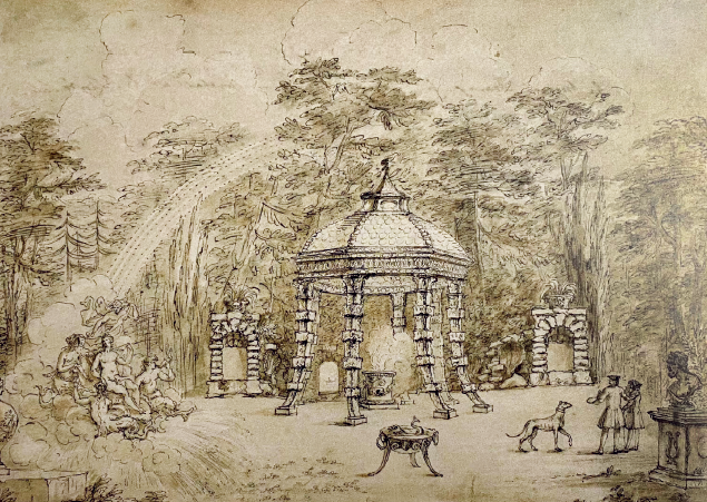 “伯林顿文人圈”里,文人、艺术家 、赞助人的交往,让这一观念迅速在他们的圈子里传播。威廉· 肯特,《蒲柏园林中的壳形神庙》,钢笔手稿,1725 年,大英博物馆藏也是在旅行中,伯林顿结识了日后被誉为“现代园林之父”的威廉·肯特。“伯林顿文人圈”的灵感,让这位年轻的艺术家找到了方向。以成熟的植物丛植和地形塑造营造自然主义风景园林、帕拉第奥主义建筑设计、神秘主义的废墟般的园林小品点缀,肯特在实践中使早期的英国自然式园林逐渐形成稳定的风格。