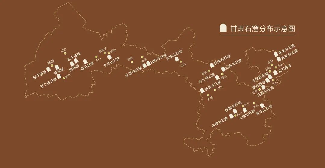 甘肃省位于我国西北部的黄河上游,地形东西狭长如天然走廊,是陆上丝绸之路的要道,也是佛教从印度经中亚向东传播的必经之地。甘肃现存石窟寺170余处,分为河西、陇中、陇南、陇东四大石窟群。自4世纪中叶至20世纪初,洞窟修建历经一千六百多年绵延不衰。