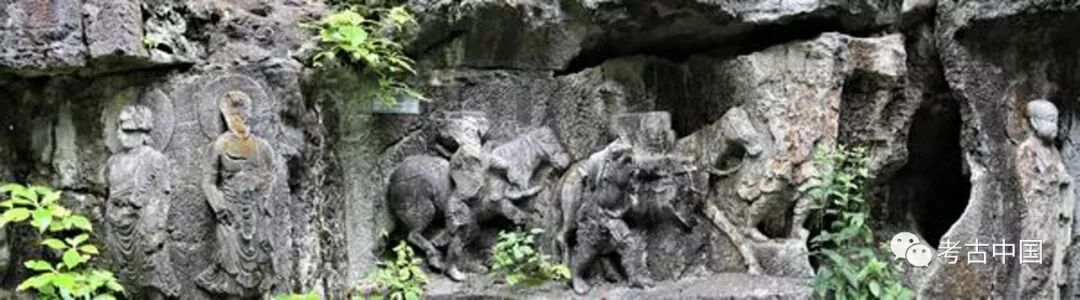 早在20世纪50年代,史岩在调查杭州南山(即飞来峰)的造像时即已确认飞来峰有一组唐僧取经故事的雕刻。(图三、四)嗣后,黄涌泉编撰《杭州元代石刻艺术》也将之命名为唐僧取经故事。这应该是关于中国境内取经图像的最早研究。对于飞来峰的这组取经图像,后来又引起了一些争鸣。