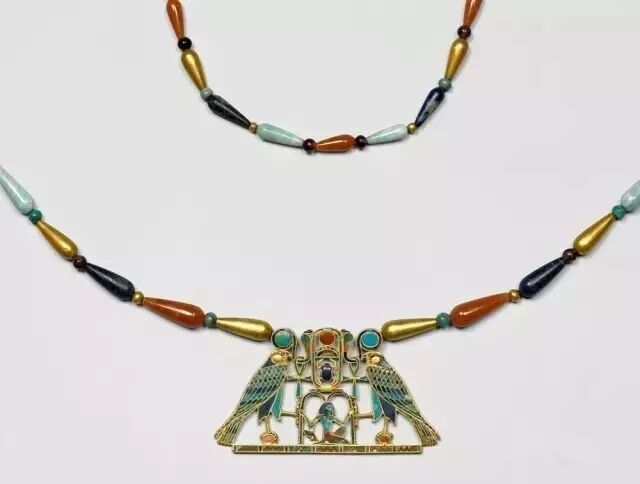 古埃及法老、贵族的首饰多用贵重金属和半宝石制成,二者都是当时人们喜爱的材料。