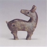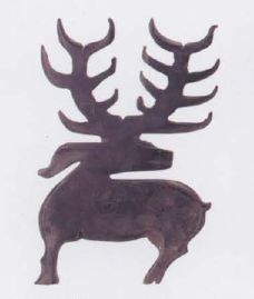 扁平体浮雕玉器多数采用了侧面剪影式的表现手法,即紧紧抓住所要表现的动物或人物等对象最主要的特征,用熟练而准确的外轮廓线勾划出生动而传神的艺术形象。玉器上的线条简洁而概括,多数依所要表现的动物人物的结构而雕琢,并且使其成为表现内容不可缺少的手法,从而使轮廓与细部有机地融为一体,形成和谐而完美的艺术风格。如宝鸡弓鱼国墓出土的7件形态各异的扁平体玉鹿。均呈站立状,有的伸首前视,有的回首作戒备状,通体几乎没有装饰纹样,仅在眼睛、鼻、吻、蹄和上肢阴刻极简练的线条。如弓鱼伯墓的一只玉鹿佩(图42),长角分歧,蟠曲而上,后背拱起,后肢微前屈,表现的是一只突然受惊的鹿,在奔跑中稍作伫立的瞬间神态,是一件绝妙的艺术品。弓鱼伯墓出土的3件玉虎均为扁平体,神态各不相同,其造型外轮廓采用复杂的曲线,身饰极简略的阴线,其中一件玉虎探首,翘尾,作急驰状,另一件玉虎昂首张口,尾巴回卷,作吼叫奔驰状(图46)。扶风黄堆老堡子43号墓出土的西周晚期玉虎,虎体瘦长,造型夸张,但仍然富有个性(图47)。