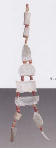 组玉佩,组玉佩中璜的数量与墓主人生前的身份地位关系密切,墓主人随葬组玉佩中璜的数量,与陪葬的青铜鼎的数量往往是相同的,因此,组玉佩应是具有等级制的装饰品,故也可视为玉礼器。扶风强家一号墓出土的组玉佩结构较为特殊,四件璜不是完全串联,而是成对串联(图23),该墓出土的无玉璜的串联式玉佩也很有特点(图24)。