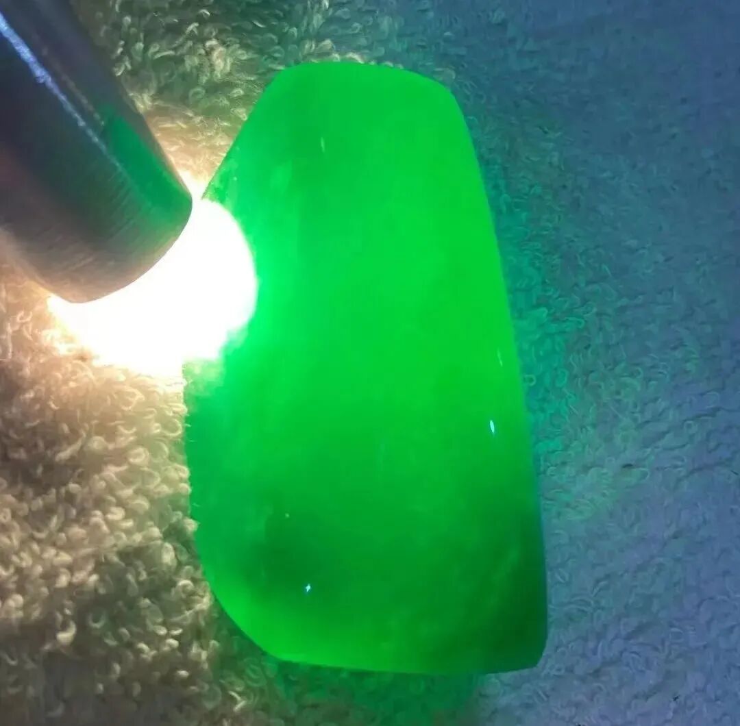 打光细看,已经去皮的肉质极为细腻水润,且颜色正绿鲜艳,乃当之无愧的帝王绿!