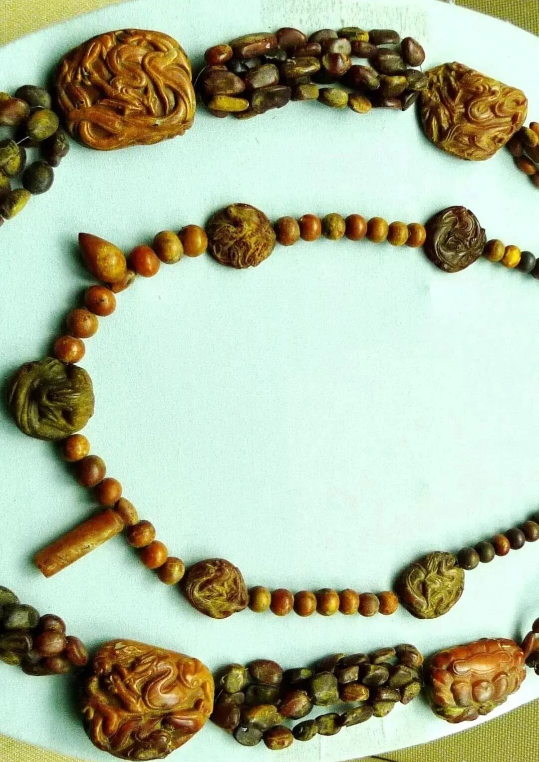 不过,出土最多琥珀、蜜蜡的要数陈国公主墓,据统计约有2101件。陈国公主(1001—1018年)耶律氏,是辽景宗皇帝孙女、秦晋国王圣宗皇太弟耶律隆庆之女。十八岁时,公主嫁给了三十岁的舅舅,两年后,两人都先后离世,大辽国王痛惜万分,倾绝世珍稀之宝以随葬。琳琅满目的珍宝布满了墓室,是仅次于皇陵的重要考古发现,一方面,它是解读神秘契丹文化的奇迹,同时,也体现着最质朴、最原始的父爱。![]()