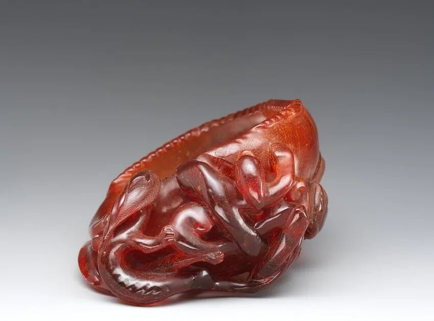 欧洲人对它的喜爱,就如同中国人爱玉石一样,是欧洲宝石文化的代表,这种宝贝就是琥珀蜜蜡。清 琥珀雕螭龙耳桃形洗 美国大都会博物馆藏