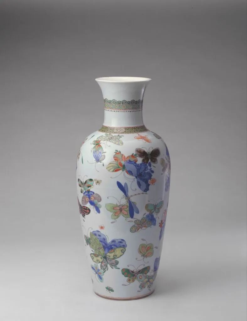 康熙青花的历史发展脉络康熙青花大致分为早、中、晚三个时期。康熙早期青花还保有明代的一些遗风,有些瓷器的釉面肥润、色泽泛青,有些青花发色深沉、晦暗;康熙中期青花,一般指1681年至1706年间的青花瓷器。此时期的青花瓷器较前期有所提高;康熙晚期青花,青花色调由中期的浓艳清翠变为浅淡、浅灰,有些呈色不稳,出现晕散。虽然康熙朝的五彩瓷器以及各种颜色釉瓷器也都很富有特色,但纵观整个瓷业生产仍以青花为主流。盛世物阜民丰,又有所偏重,故而清康熙青花器烧造数量大、流传范围广,显示出蓬发的盛世气息。清康熙 五彩蝴蝶纹瓶