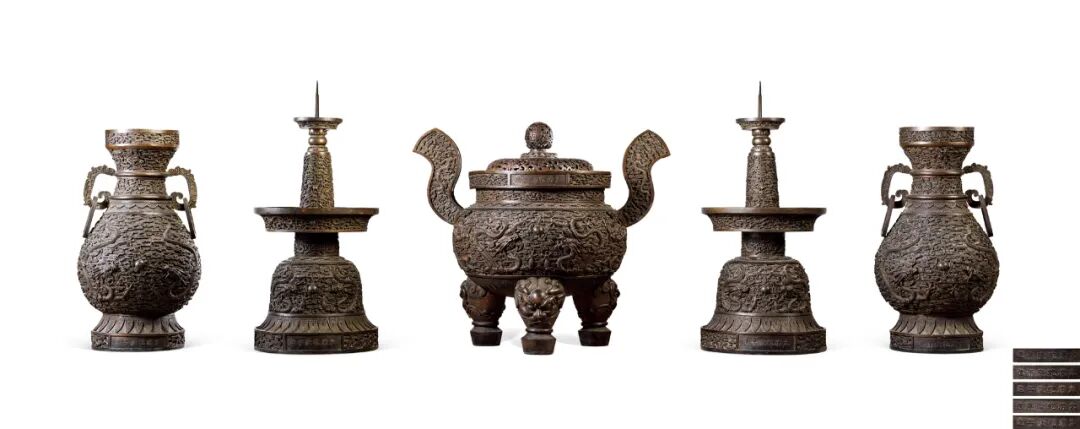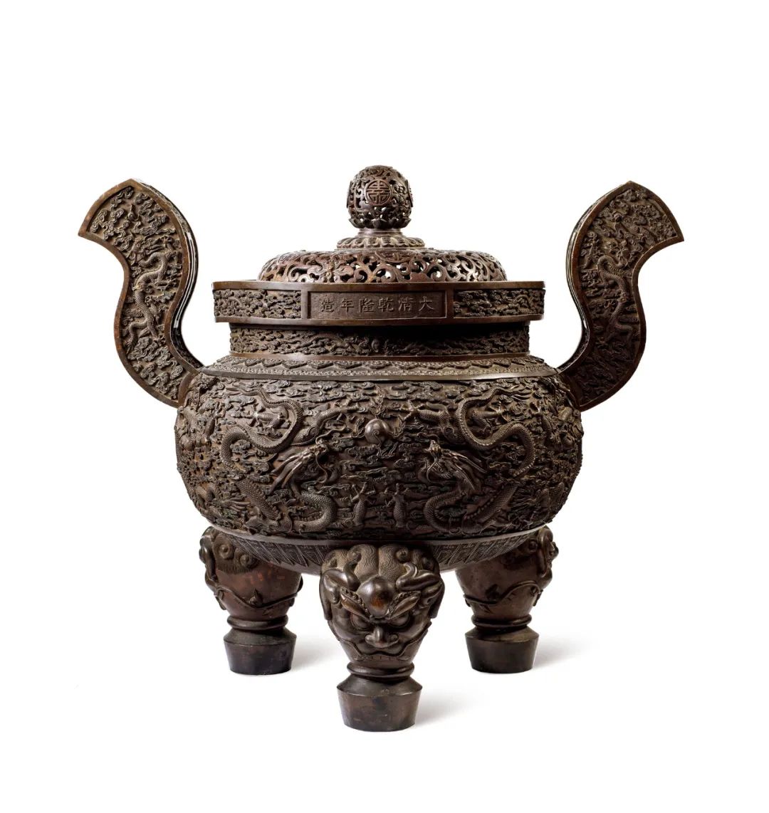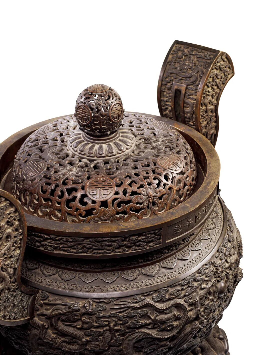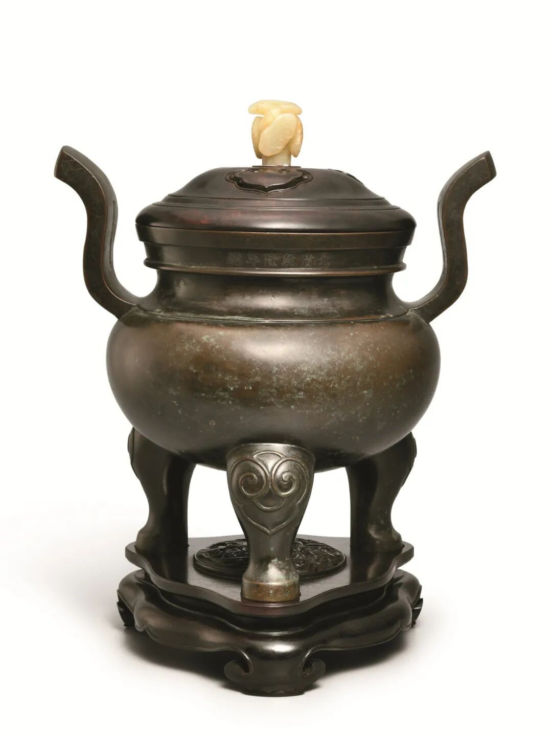 拍品估价:20,000,000 - 25,000,000 人民币尺寸:炉宽 87cm,高 78cm;瓶高 75cm,高 76cm;烛台高 79cm(含烛杆总高92cm),宽 43cm;共重 735kg北京保利2021秋季拍卖会 禹贡Ⅱ—郎世宁绘《纯惠皇贵妃油画像》暨重要宫廷艺术 Lot 5570展览:保利艺术研究院、保利艺术博物馆,“弘历的世界II——郎世宁绘《纯惠皇贵妃油画像》暨18世纪盛清宫廷艺术的西洋风”,北京,2021年10月15日-11月02日1.19世纪晚期,20世纪初期,由驻华意大利大使所得珍藏,后由家族继承2.香港苏富比2008年04月44日,编号2826,成交价HKD 22,727,5003.奉三堂艺术协会馆藏(David Huang & Son Art Foundation)拍品估价:13,000,000 - 16,000,000 人民币尺寸:炉长 18.7cm,宽 11cm;瓶高 13.8cm;盒长 7cm,宽 7cm,高 5.2cm中贸圣佳2021春季拍卖会 璀璨——古代艺术珍品夜场 Lot 0946拍品估价:3,800,000 - 4,800,000 人民币中贸圣佳2021春季拍卖会 九希——牧心斋明清御制铜炉专场 Lot 0908来源:王世襄先生旧藏,1951 年 7 月 12 日购于庞敦敏处1.中国嘉德2003年秋季拍卖会,俪松居长物——王世襄、袁荃猷珍藏中国艺术品,Lot 11282.北京匡时 2010 年秋季拍卖会,锦灰吉金——王世襄藏铜炉专场,Lot 0006拍品估价:3,500,000 - 4,500,000 人民币中贸圣佳2021上海秋季拍卖会 璀璨——中国书画及古代艺术珍品夜场 Lot 0970拍品估价:3,000,000 - 3,600,000 人民币尺寸:宽 27cm;炉重 7100g;座重 3765g北京保利2021秋季拍卖会 禹贡Ⅱ—郎世宁绘《纯惠皇贵妃油画像》暨重要宫廷艺术 Lot 55771.《金玉青烟——杨炳祯先生珍藏明清铜炉》,台湾历史博物馆,1996年,页118,图152.《宝器颺馨——读书楼藏明清铜炉》,台湾历史博物馆,2009年,页32、33,图73.《吉金——明清铜炉特展》,天津人民美术出版社,2015年,页223,图2031.金玉青烟——杨炳祯先生珍藏明清铜炉,台湾历史博物馆,1996年2.宝器颺馨——读书楼藏明清铜炉,台湾历史博物馆,2009年拍品估价:2,200,000 - 3,200,000 人民币尺寸:直径 16.6cm;口径 11.2cm;高 10cm中国嘉德2021春季拍卖会 钟鼎茗香 荣斋吉金 Lot 31391.《钟鼎茗香—荣斋宣炉清赏(一)》,刘锡荣着,文物出版社,2010年,第100、101页;2.《钟鼎茗香—世襄旧物新赏(四)》,刘锡荣着,文物出版社,2014年,第136、141页。展览:《钟鼎茗香 荣斋吉金—明清铜炉展》,2021年4月,嘉德艺术中心。拍品估价:2,200,000 - 2,800,000 人民币中贸圣佳2021春季拍卖会 九希——牧心斋明清御制铜炉专场 Lot 0902拍品估价:1,500,000 - 2,000,000 人民币中贸圣佳2021春季拍卖会 九希——牧心斋明清御制铜炉专场 Lot 0903拍品估价:1,500,000 - 2,000,000 人民币中贸圣佳2021春季拍卖会 九希——牧心斋明清御制铜炉专场 Lot 0907《康熙己丑年桂月制》、《玉堂清玩》、《奕》、《书》款拍品估价:1,800,000 - 2,200,000 人民币中贸圣佳2021上海秋季拍卖会 璀璨——中国书画及古代艺术珍品夜场 Lot 0968拍品估价:1,200,000 - 1,500,000 人民币上海匡时2021年春季拍卖会 云水禅心—佛教及铜炉艺术精粹 Lot 0603拍品估价:1,800,000 - 2,200,000 人民币中贸圣佳2021春季拍卖会 九希——牧心斋明清御制铜炉专场 Lot 0904拍品估价:600,000 - 800,000 人民币中贸圣佳2021春季拍卖会 九希——牧心斋明清御制铜炉专场 Lot 0909拍品估价:1,500,000 - 2,000,000 人民币中贸圣佳2021春季拍卖会 璀璨——古代艺术珍品夜场 Lot 0945拍品估价:600,000 - 800,000 人民币中国嘉德2021春季拍卖会 钟鼎茗香 荣斋吉金 Lot 3120展览:《钟鼎茗香 荣斋吉金—明清铜炉展》,2021年4月,嘉德艺术中心。拍品估价:2,000,000-2,800,000 人民币华艺国际(北京)2021春季拍卖会 侍香——明清铜炉专场 Lot 2315拍品估价:2,000,000 - 3,000,000 人民币北京华艺国际2021秋季拍卖会 静观——历代造像·铜炉专场 Lot 1529清 大清咸丰年造浮雕双龙戏珠朝冠耳炉