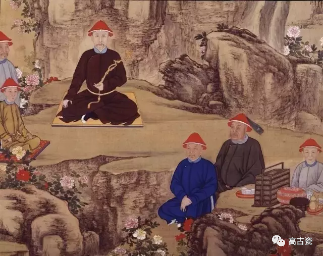 《清人画胤禛行乐图轴》中,绘制了雍正皇帝外出的一个场景。皇帝手持如意端坐于山林之中,在画面右侧,于石台上放置了外出携带的茶碗、茶壶等。这其中最为典型的便携式茶器,是一套茶具箱。