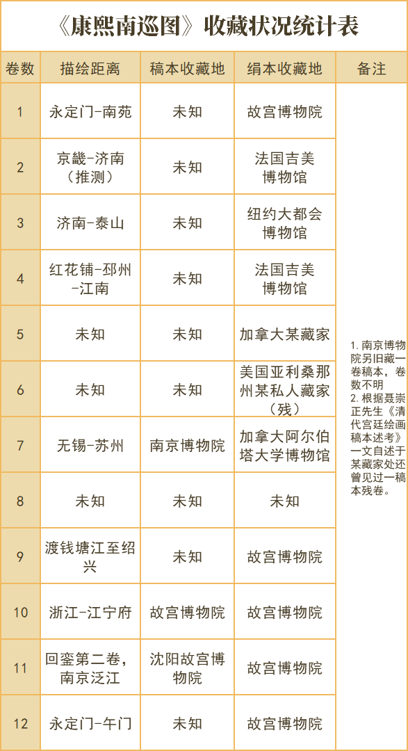 有清一代,凡画中有皇帝肖像的作品都存放在皇城内景山以北的寿皇殿中,《康熙南巡图》也应如是。而寿皇殿正是八国联军当中法国军队的势力范围;而多卷南巡图作品均首先出现于法国,应佐证了南巡图是被“八国联军”中的法国军队所劫掠。