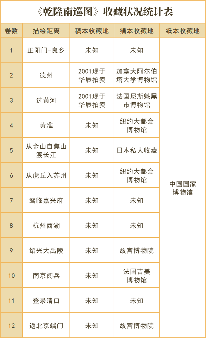 现知,《康熙南巡图》存世正本第一、第九、第十、第十一、第十二卷藏于故宫博物院;第二、第四卷藏于法国吉美博物馆;第三卷藏于纽约大都会博物馆;第七卷藏于加拿大亚伯达大学博物馆;第五、第六卷则分别收于加拿大、美国私人藏家手中,另有第八卷下落不明。