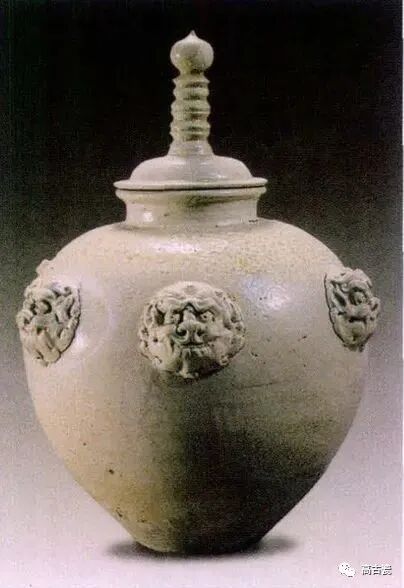 器盖顶呈宝塔形,下部呈覆碟形,宽平沿。器体口稍卷,短直颈,鼓腹,小平底,上腹部饰兽面贴花六个。通体施白色透明釉,釉色略泛青,釉层薄而均匀,为隋到初唐产品。