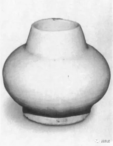 盘形口,束颈,溜肩,鼓腹,饼形足。胎呈灰白色,有小气孔。内外壁施白色透明釉,稍呈淡青色,底部露胎。