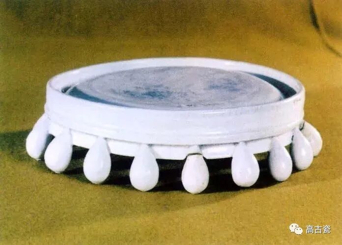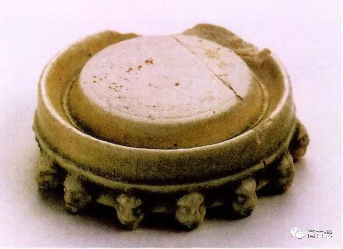 整体呈圆盘形,周体有 18 个泥珠形足。砚心不施釉,周体施泛蓝色白釉,釉色光亮润泽。此砚造型独特,制作精巧,应为隋至初唐产品。