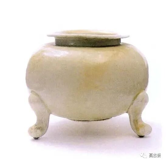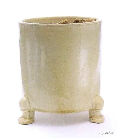 厚沿,筒形体,平底,三个短足。周体施白色透明釉,釉层均匀,稍泛淡黄色。