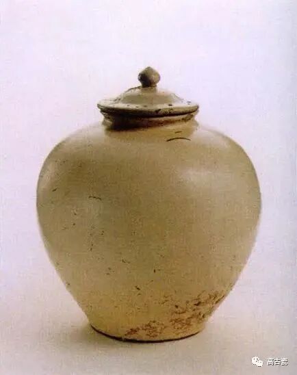 圆唇,卷沿,束颈,广肩,鼓腹,饼 形足,足下部斜削一周。器盖为隆顶,宝珠形 纽,盖下为子母口。器整体为白色,瓷胎略泛灰。器外壁施白色透明釉至足部,釉层薄而均匀。为隋到初唐产品。