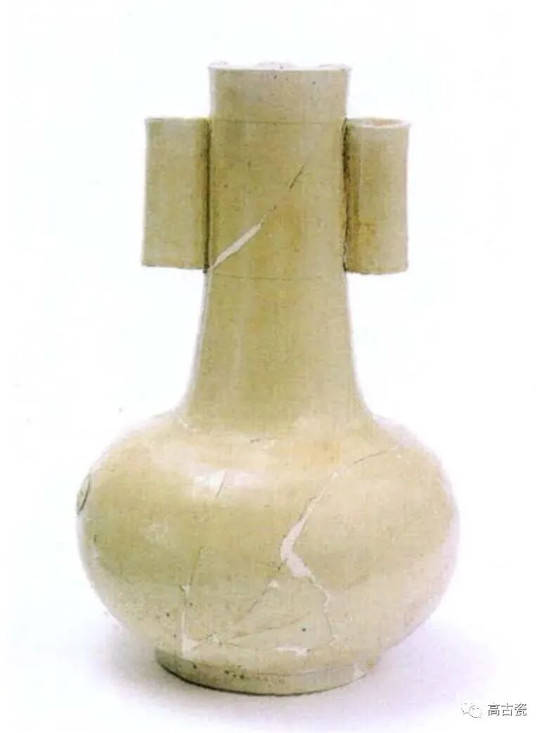 直口,长颈,鼓腹,饼形足,颈上有 一对称筒形耳,口下有两周弦纹。灰白胎,通体敷一层化妆土,器表施白釉至下腹部。