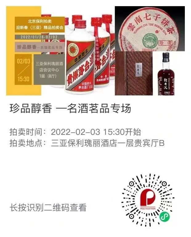 金牛俯首辞旧岁,瑞虎腾跃迎新春。在壬寅年新春佳节即将到来之际,保利拍卖将于1月28日至2月6日在三亚保利瑰丽酒店举办北京保利拍卖迎新春(三亚)精品拍卖会和新春大集名酒茗品展卖会届时,北京保利拍卖名酒茗品部为各位藏家精选了从八十年代初期的棉纸地方国营、号称当时将军酒的八十年代特供的酱瓶地方国营、各个年份的铁盖茅台及飞天五星各次新酒的原箱,包括人民大会堂特供陈酿、暑期特供、国宴和精品茅台同时进行展卖。此外还有热门的日本和英国威士忌佳酿,其中包括麦卡伦经典稀缺年份的佳酿,极高的性价比为您呈现出各类珍品美丽的盛宴。同时,各类珍藏级普洱老,如八八青饼、大益白菜、孔雀高端中期老茶,还有白茶和珍稀老陈皮,也将齐聚海岛,给各位新老藏家带来一场高品质的味觉体验。