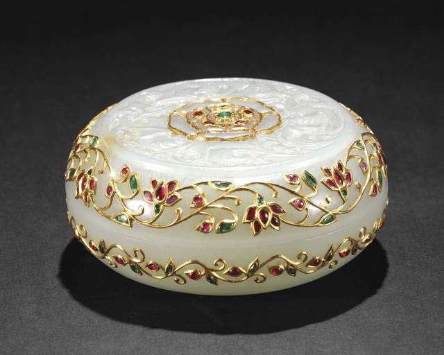 清乾隆 痕都斯坦式白玉错金嵌宝盖碗