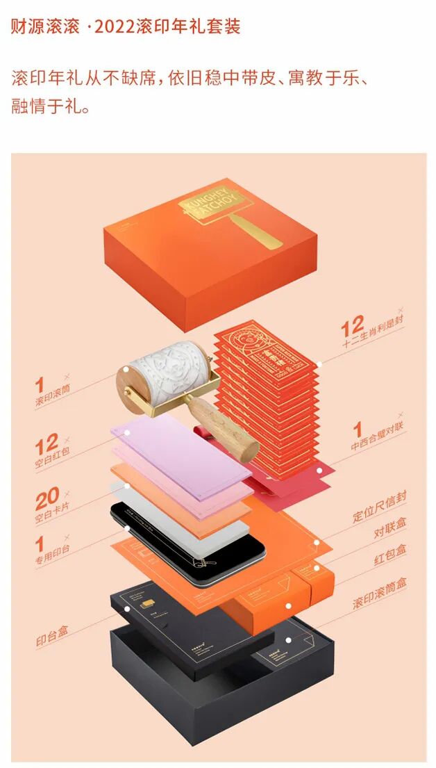 “财源滚滚”年礼套装内含雕版滚筒印刷工具、印泥、空白利是封、12生肖烫金利是封、好运连连春联、月历等小物件,让旧物件变身新玩具。复活了传统年画工艺,让大家可以亲手尝试滚印年画,滚出财运来~