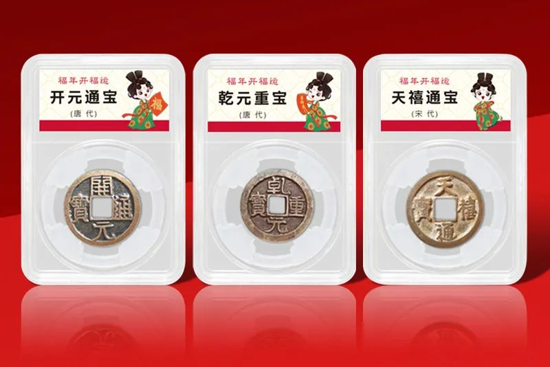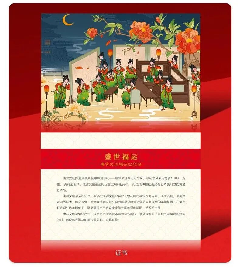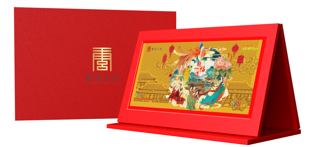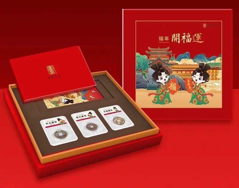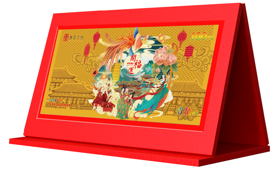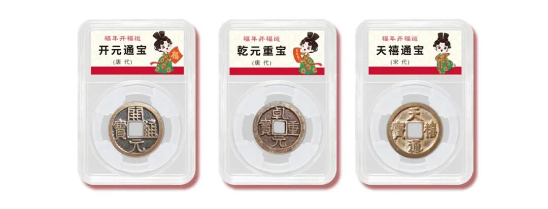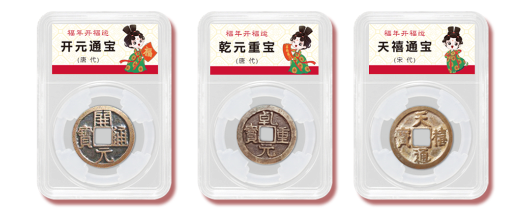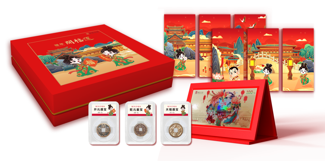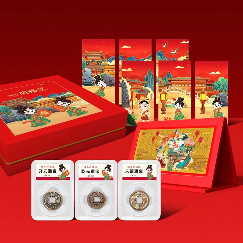 套装中,含唐宫文创:福运纪念金1张;开元通宝、乾元重宝、天禧通宝各1枚!还赠送6个唐宫文创国风红包!超级赞~