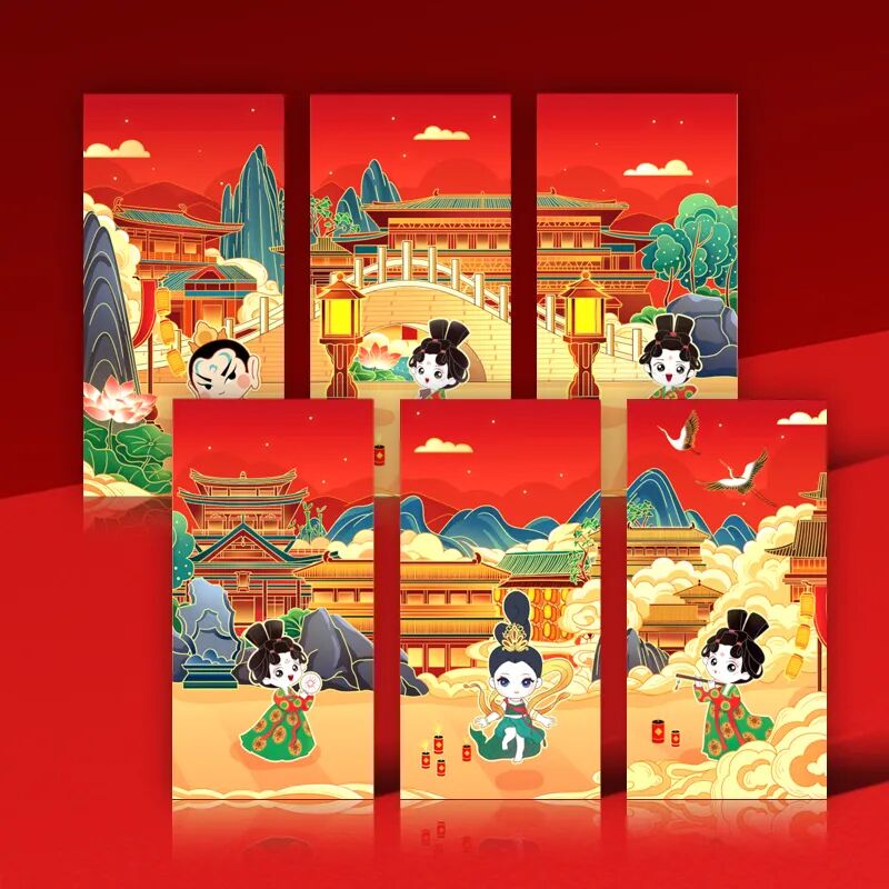 沿袭唐代习俗,以唐宫节目场景及IP人物为创作原型,打造原创手绘唐宫国风红包六枚。