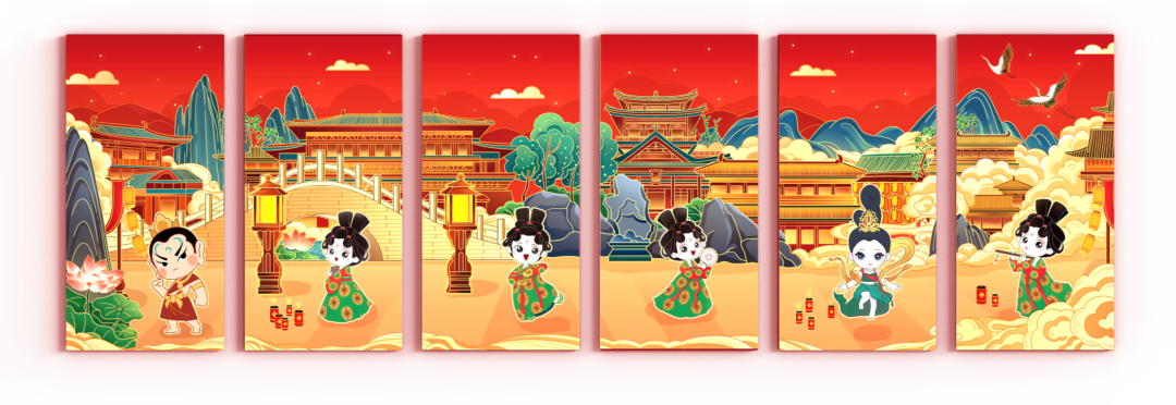 红包插画相连组成一幅妙趣横生的大唐景象,大唐盛世、红红火火,为新春添一个好彩头!