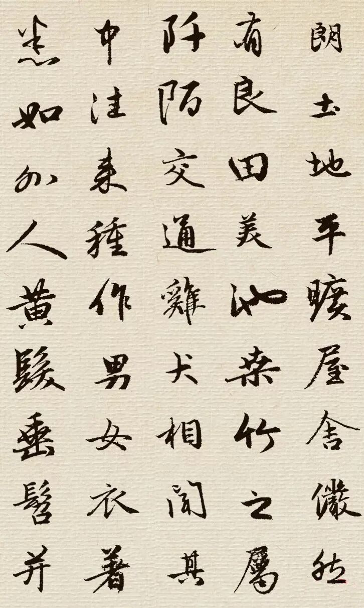 朗。土地平旷,屋舍俨然,有良田美池桑竹之属。阡陌交通,鸡犬相闻。其中往来种作,男女衣着,悉如外人。黄发垂髫并
