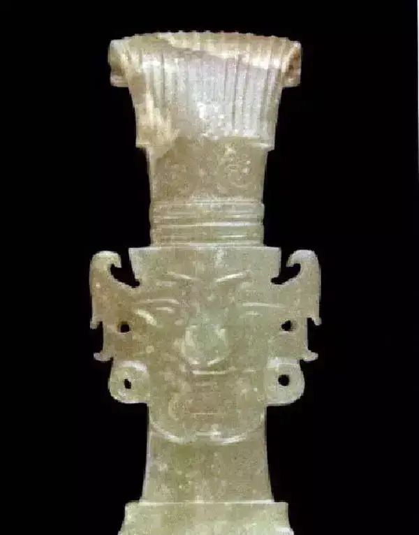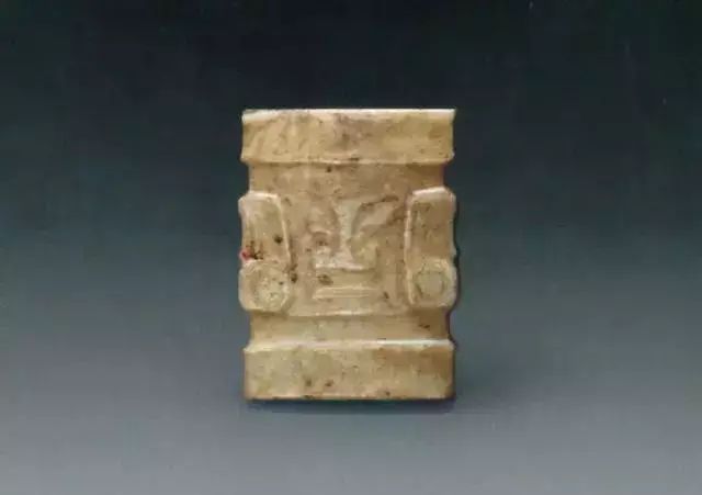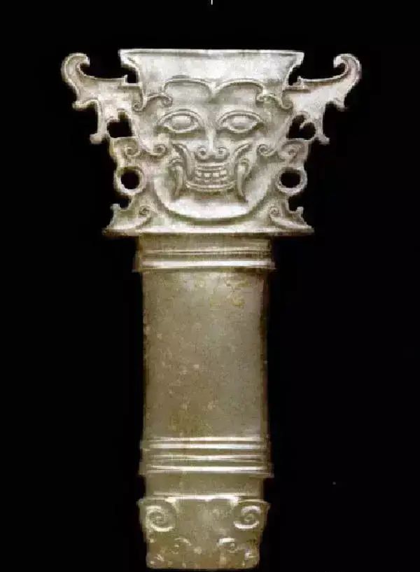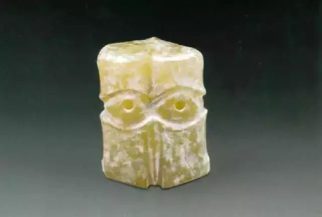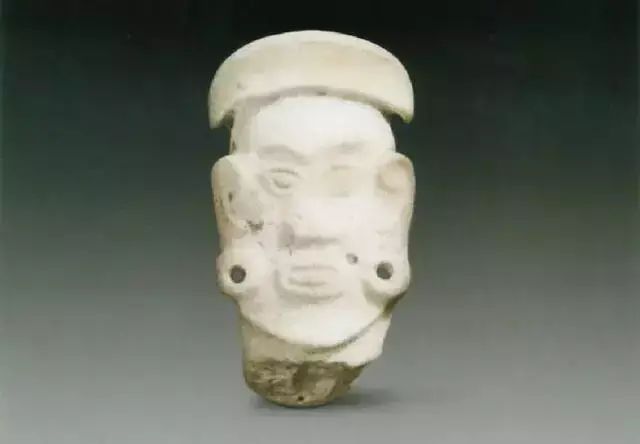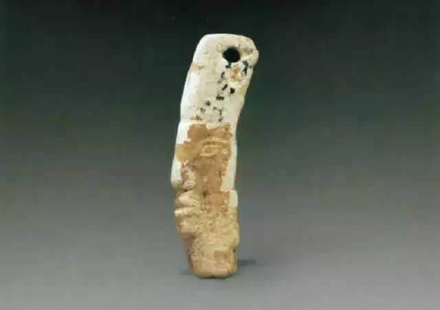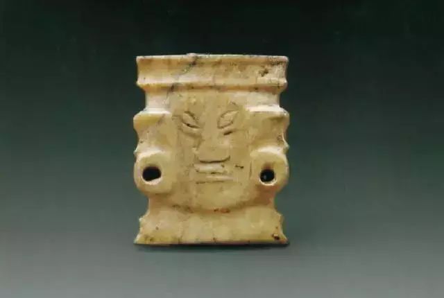 上图为石家河文化人头形玉坠,肖家屋脊出土,青黄色玉质,表面有灰绿色沁斑,在一根玉管表面浮雕出人头像。