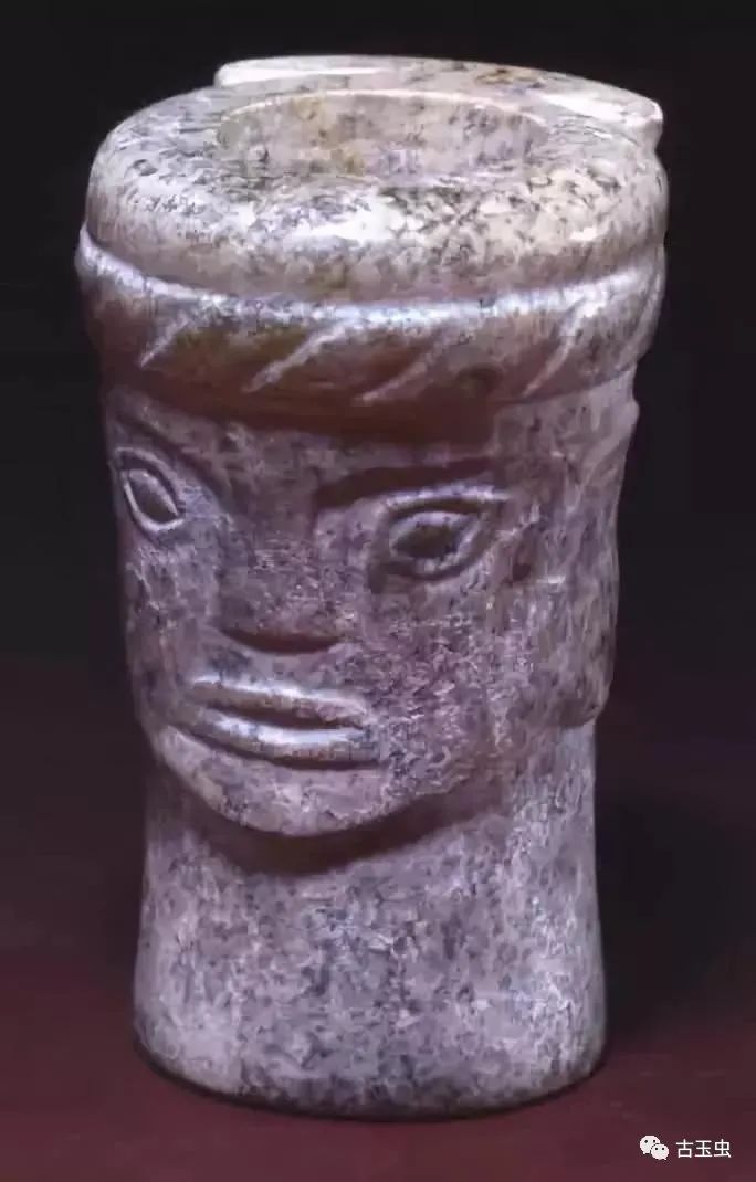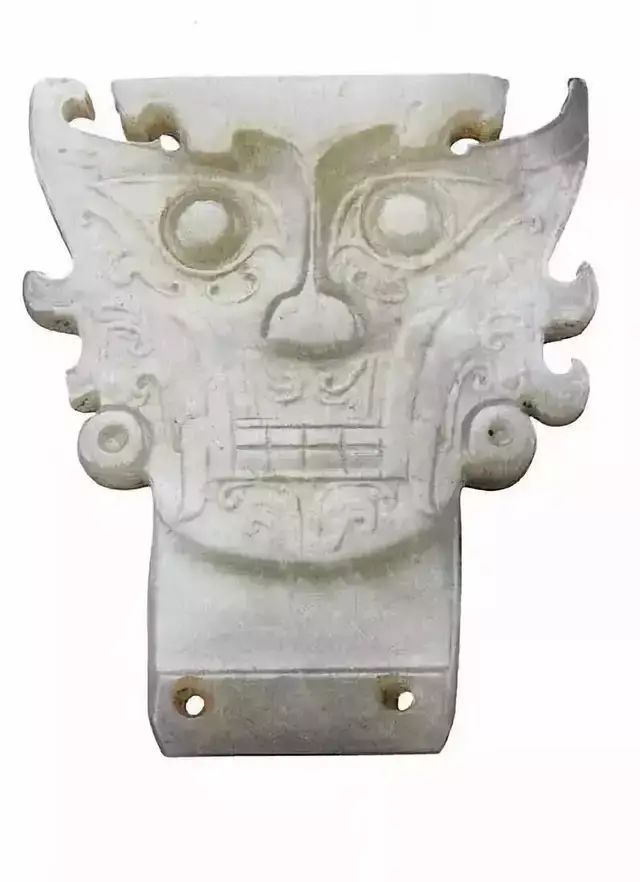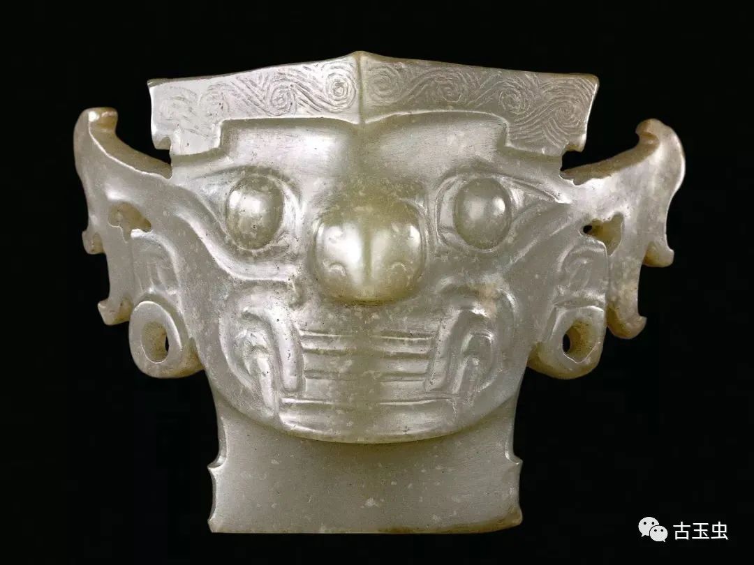 上图为石家河文化玉人头像,肖家屋脊出土,黄绿色玉质,表面有乳白色斑点。