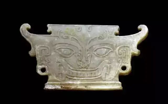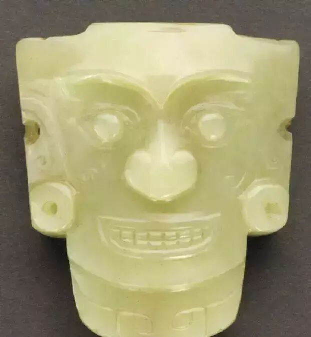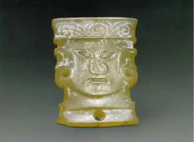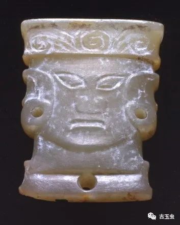 上图为石家河文化人头形玉饰,肖家屋脊出土,青黄色玉质,表面有乳白色斑,人头像雕刻于一块玉戈上,以玉戈外缘为轴将人面一分为二分刻于玉戈两面。