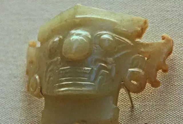 上图为石家河文化玉人头像,谭家岭出土,青玉质,五官清晰、匀称,耳朵为一对飞鸟,耳垂部穿孔,口中露出两排牙齿,口角有上下两对獠牙。