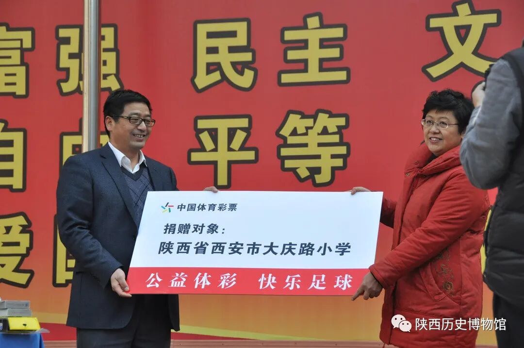 2015年体育彩票快乐足球活动向大庆路小学捐赠运动器材。