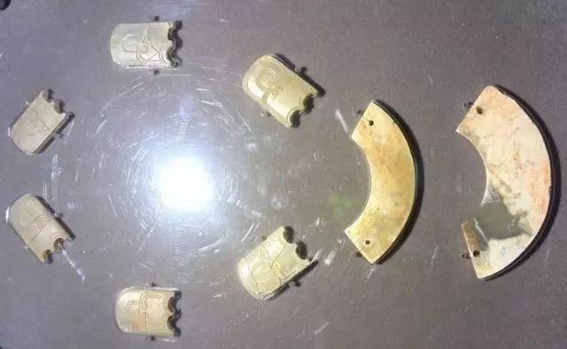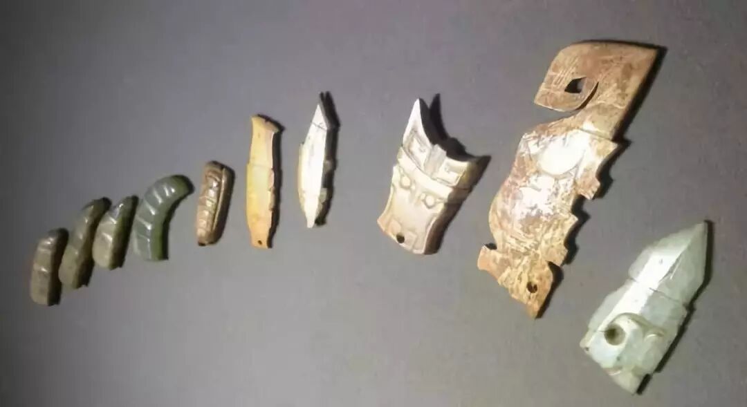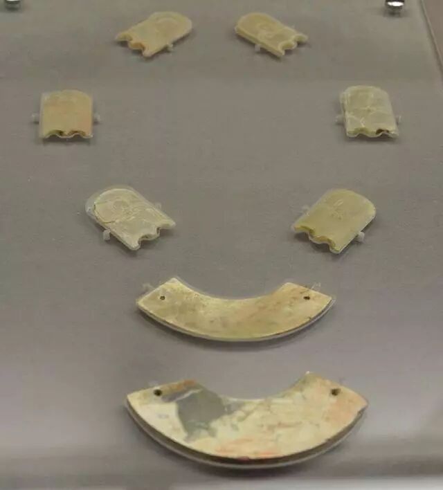 上图为山西翼城大河口西周霸国墓地出土的玉覆面,由玉蚕、玉虎、玉戈、玉璜组成。
