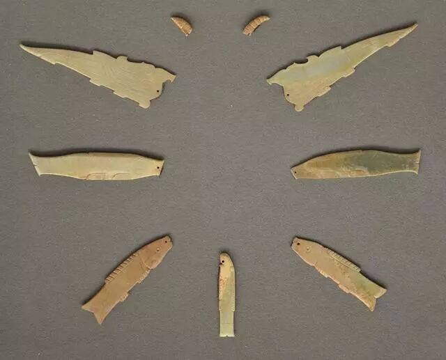上图为山西翼城大河口西周霸国墓地出土的玉头饰,由玉鸟、玉鱼、玉蚕组成。
