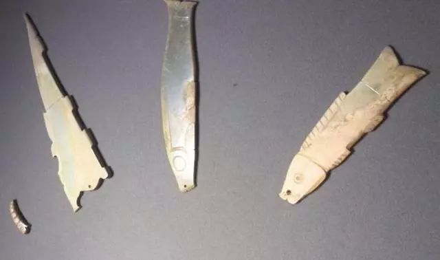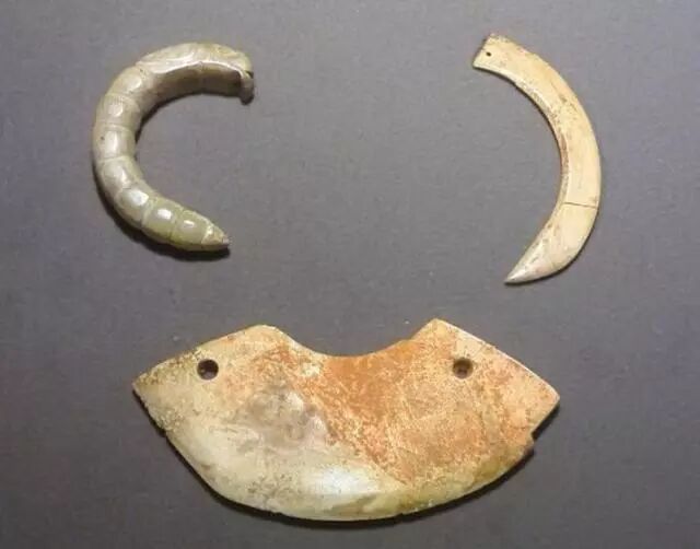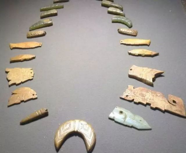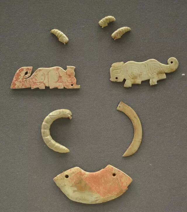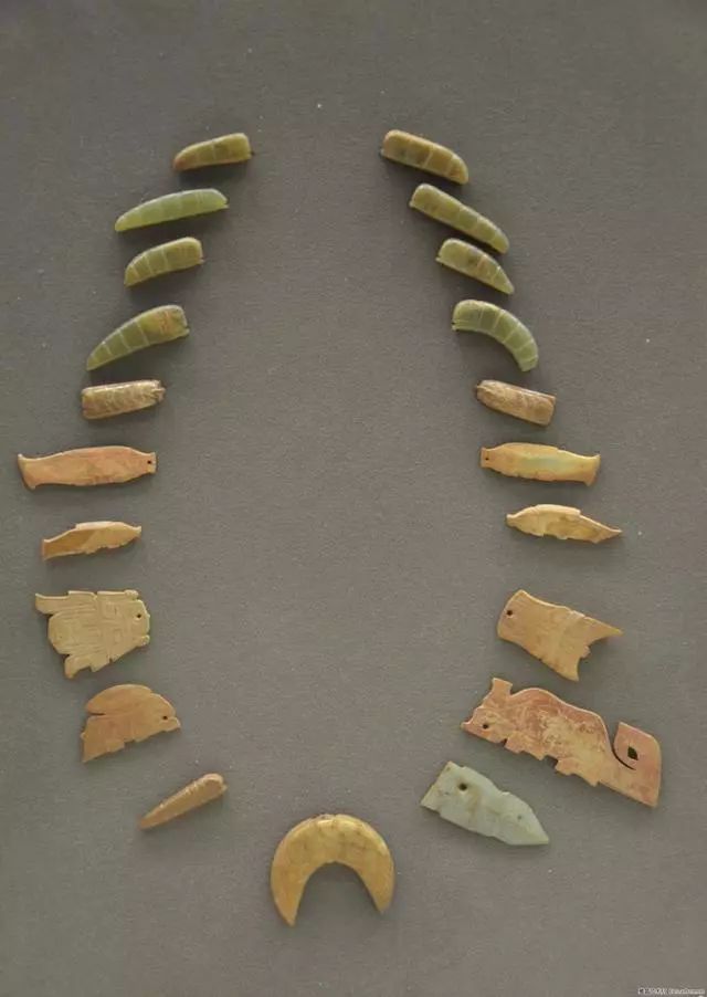 上图为山西翼城大河口西周霸国墓地出土的玉串饰,有玉蚕、玉虎、玉鱼、玉鸟、玉兔、玉戈等。