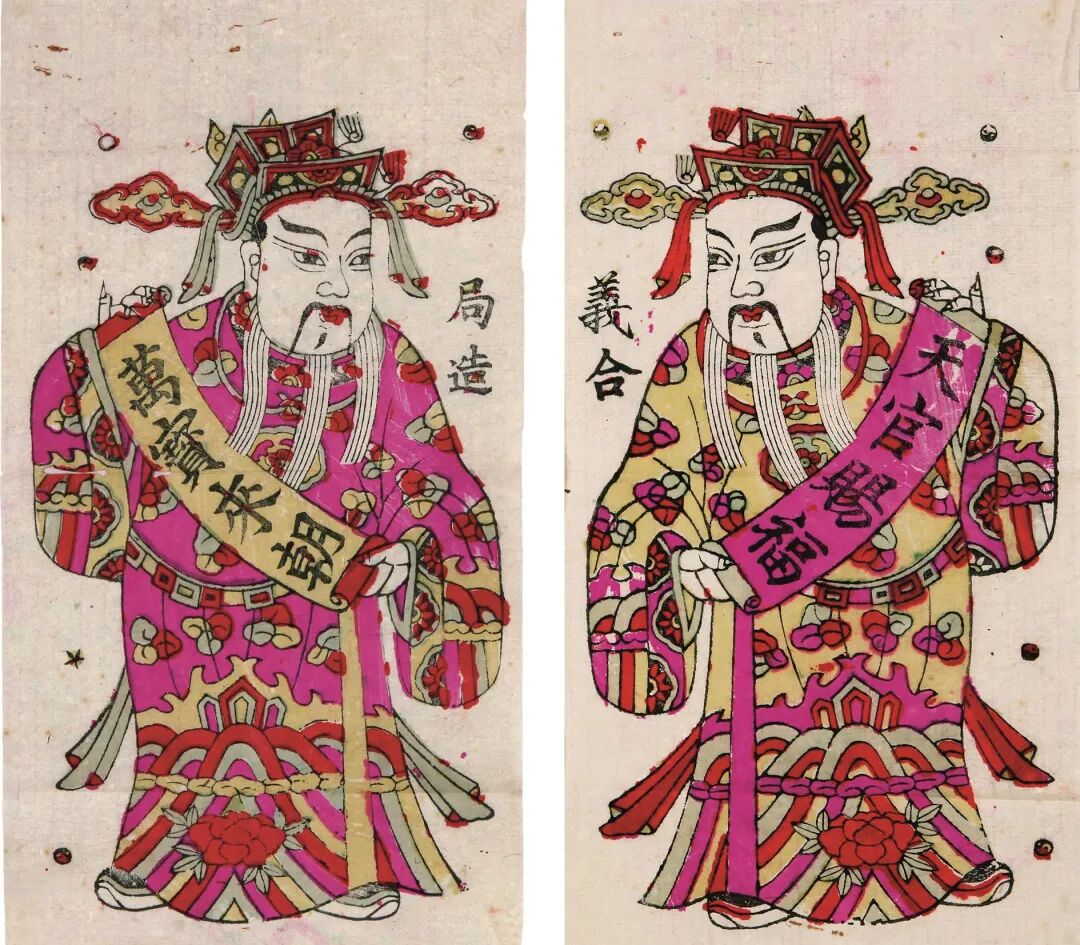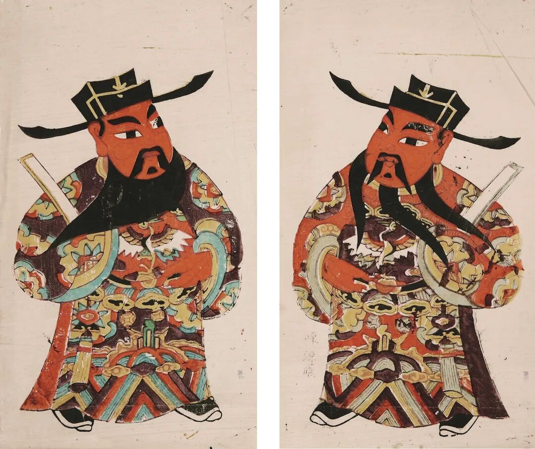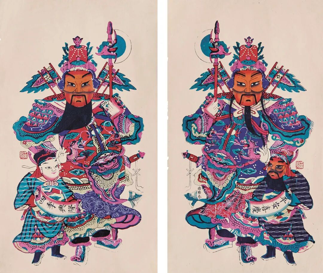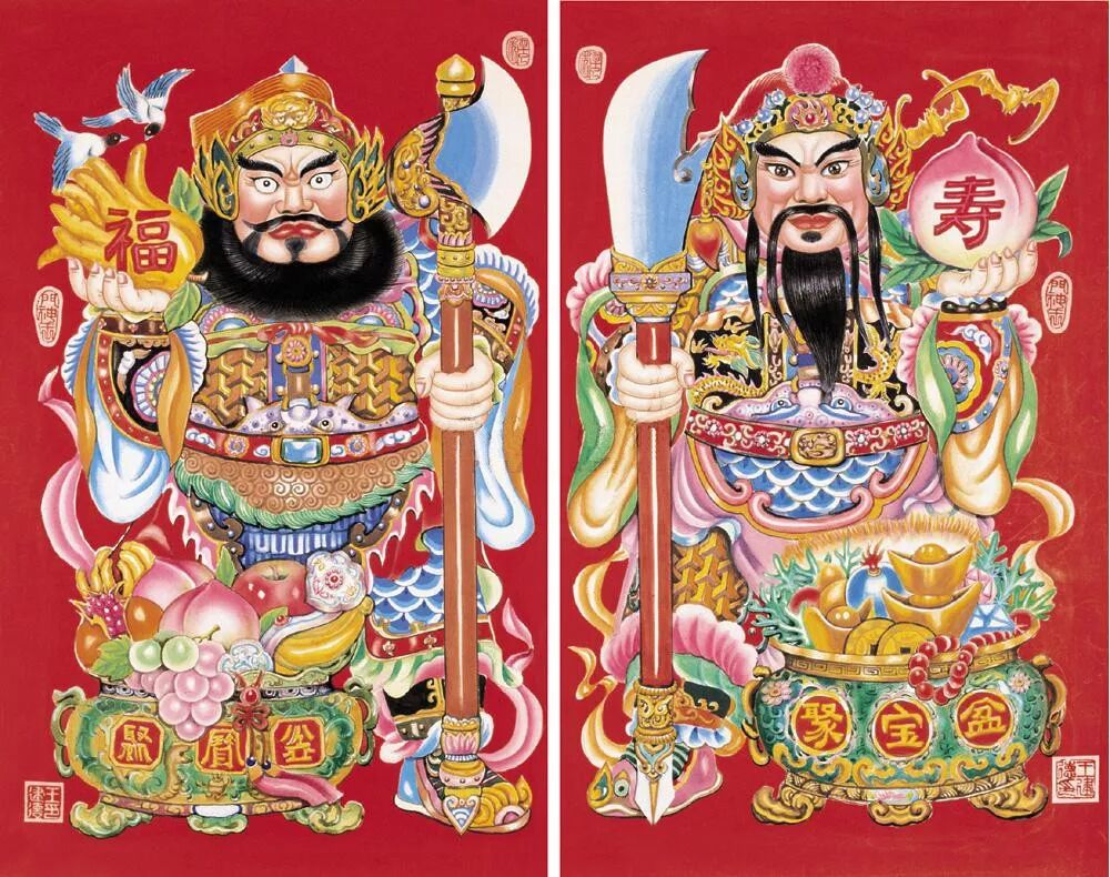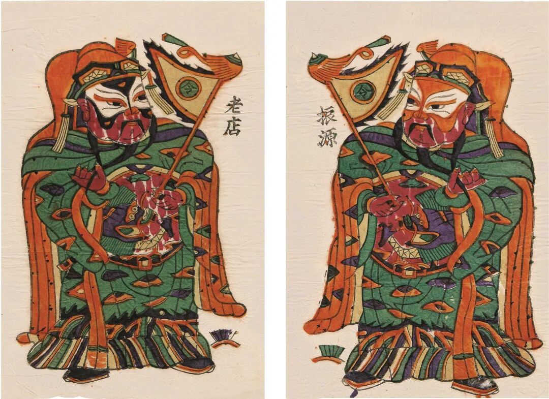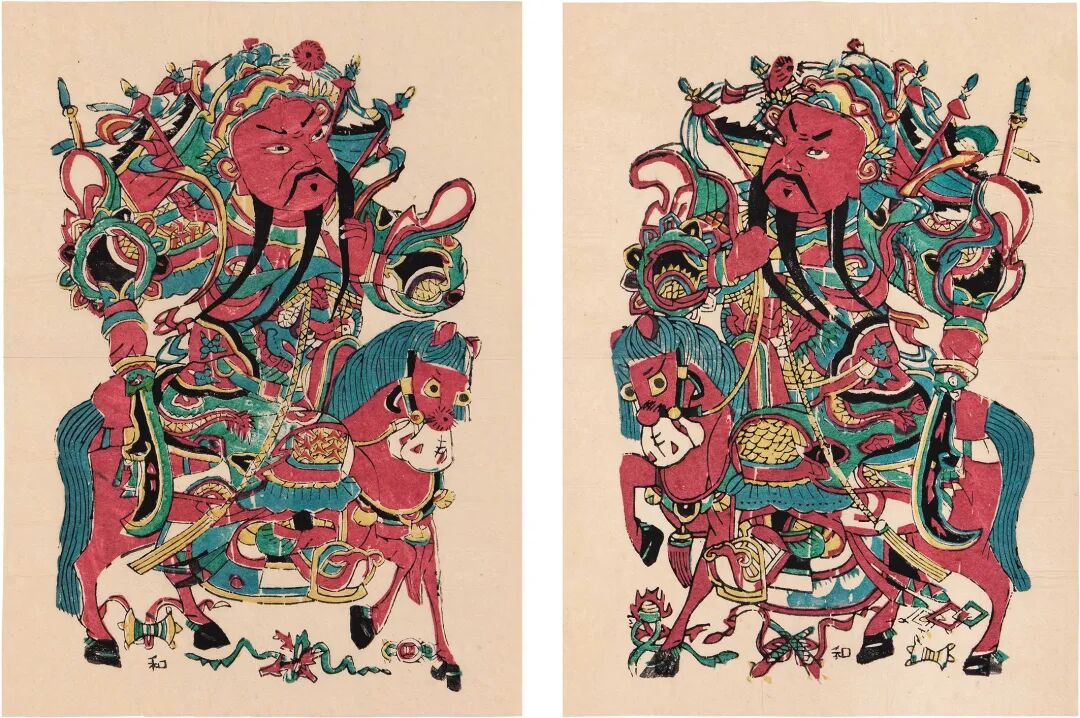 还有一个特殊人物就是关公,关公的信仰在民间尤盛,被当作是忠义无双的典范,在清代河北武强年画中,双扇门板可以贴两个对称的关公,还可以单独一张,贴在单扇门板上,可谓可双可单。