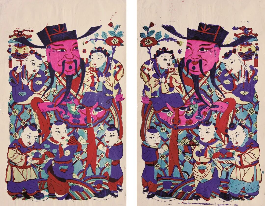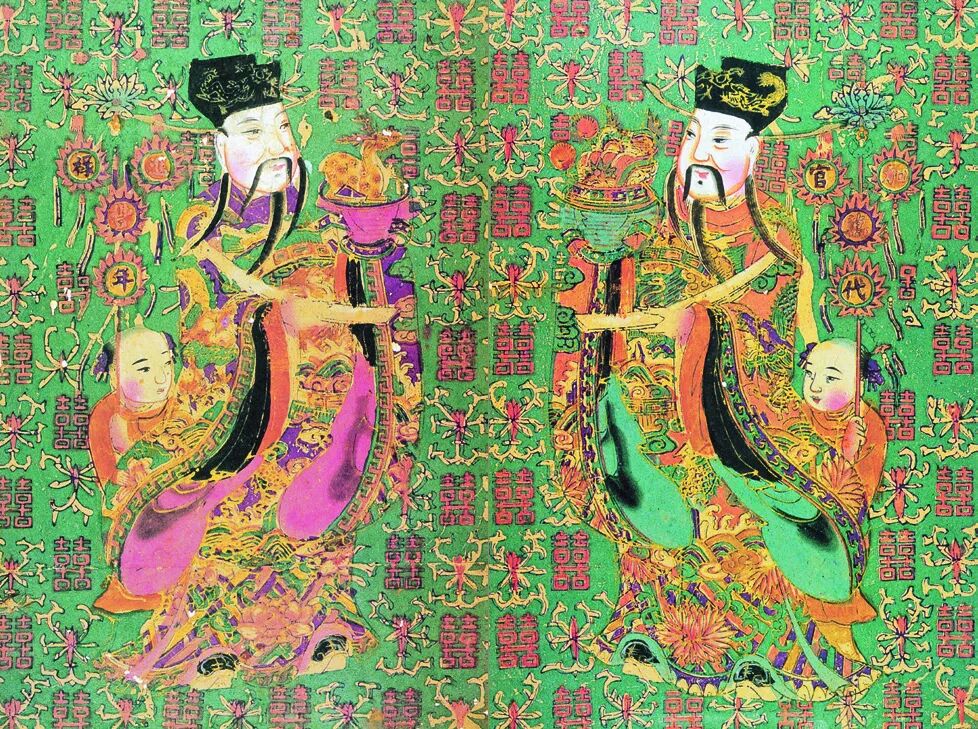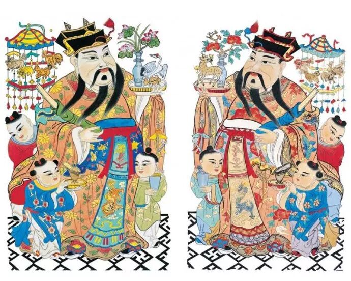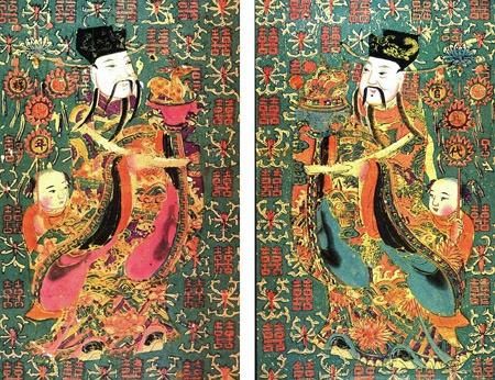中国人的信仰极为功利,功利则边界不明,因而门神也时常混沌,在门神中加入了多子多福的观念,就是童子门神,加入了科场高中的观念,就是状元门神,状元和童子叠加,便是五子登科门神,加入财神,就是进财门神,总之,好事都要占全——