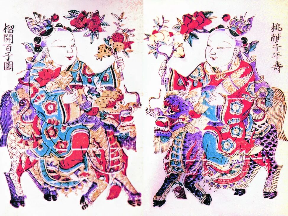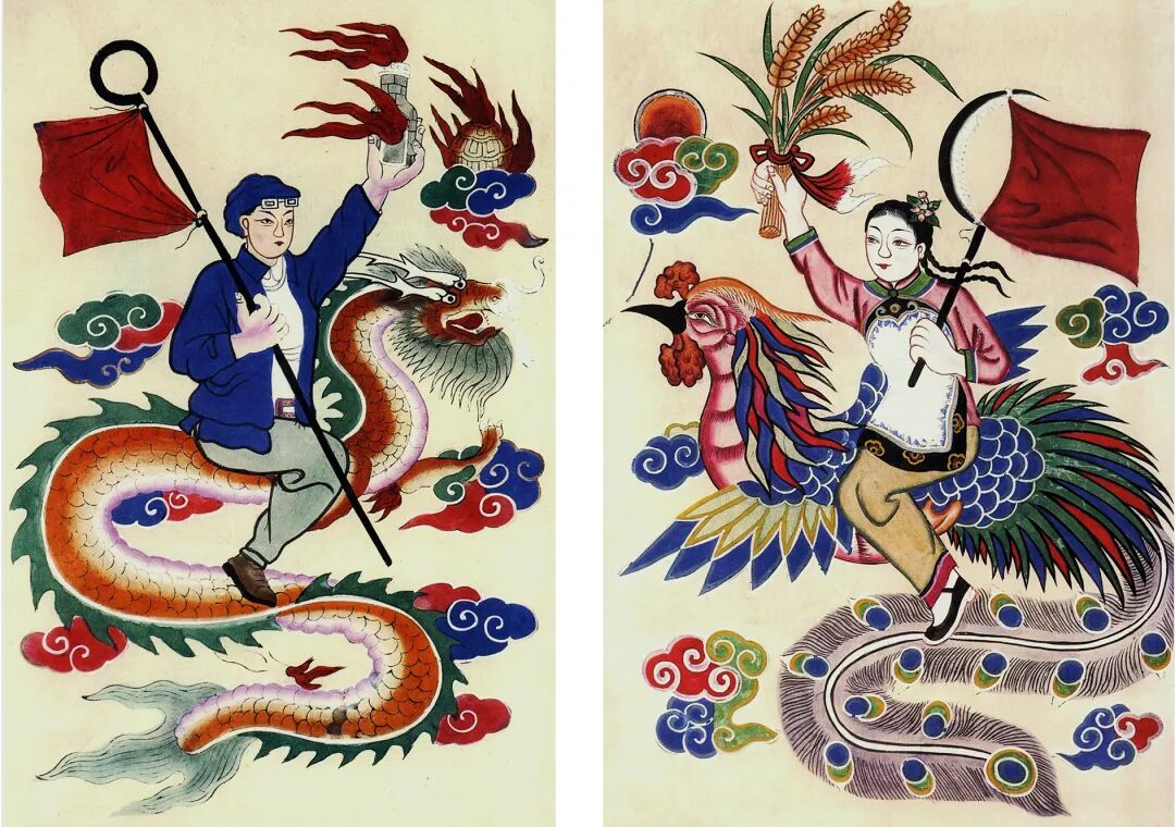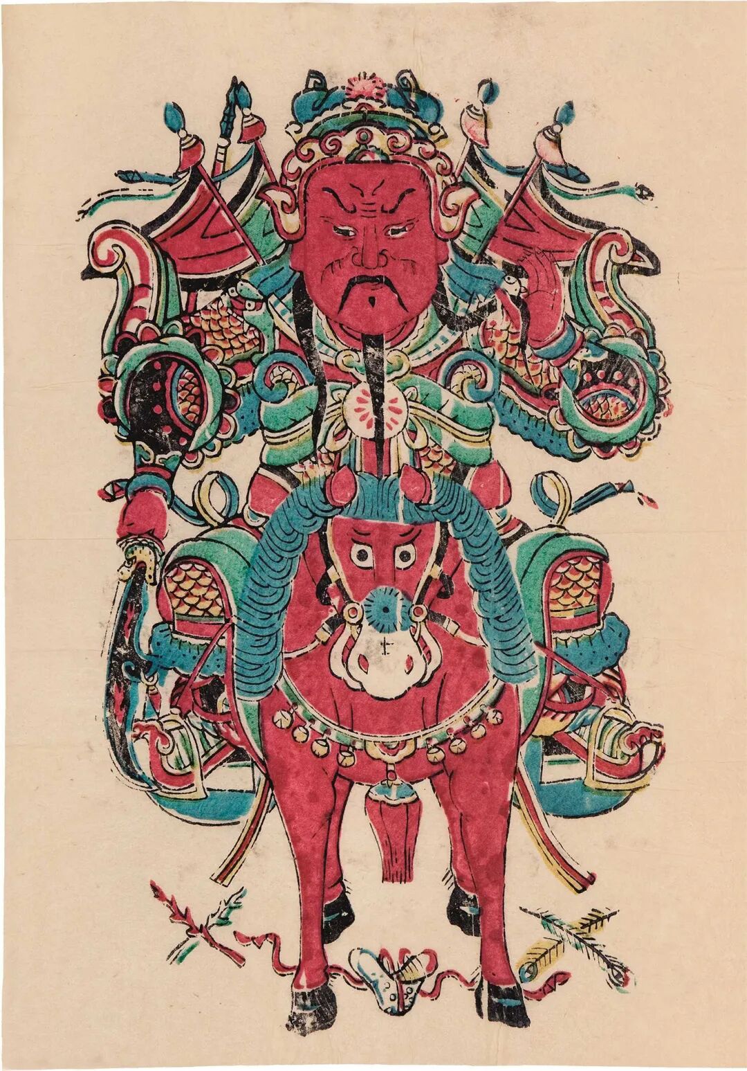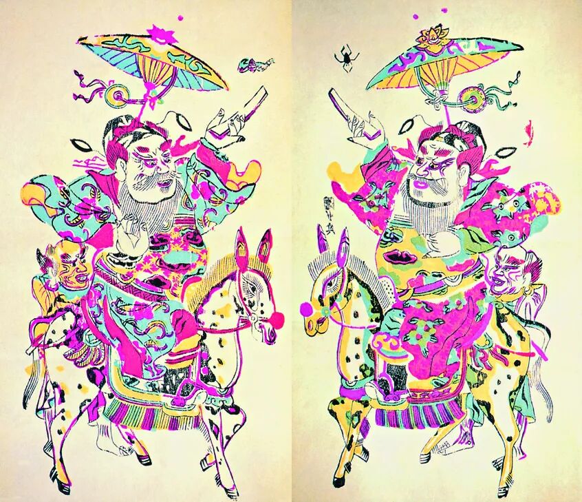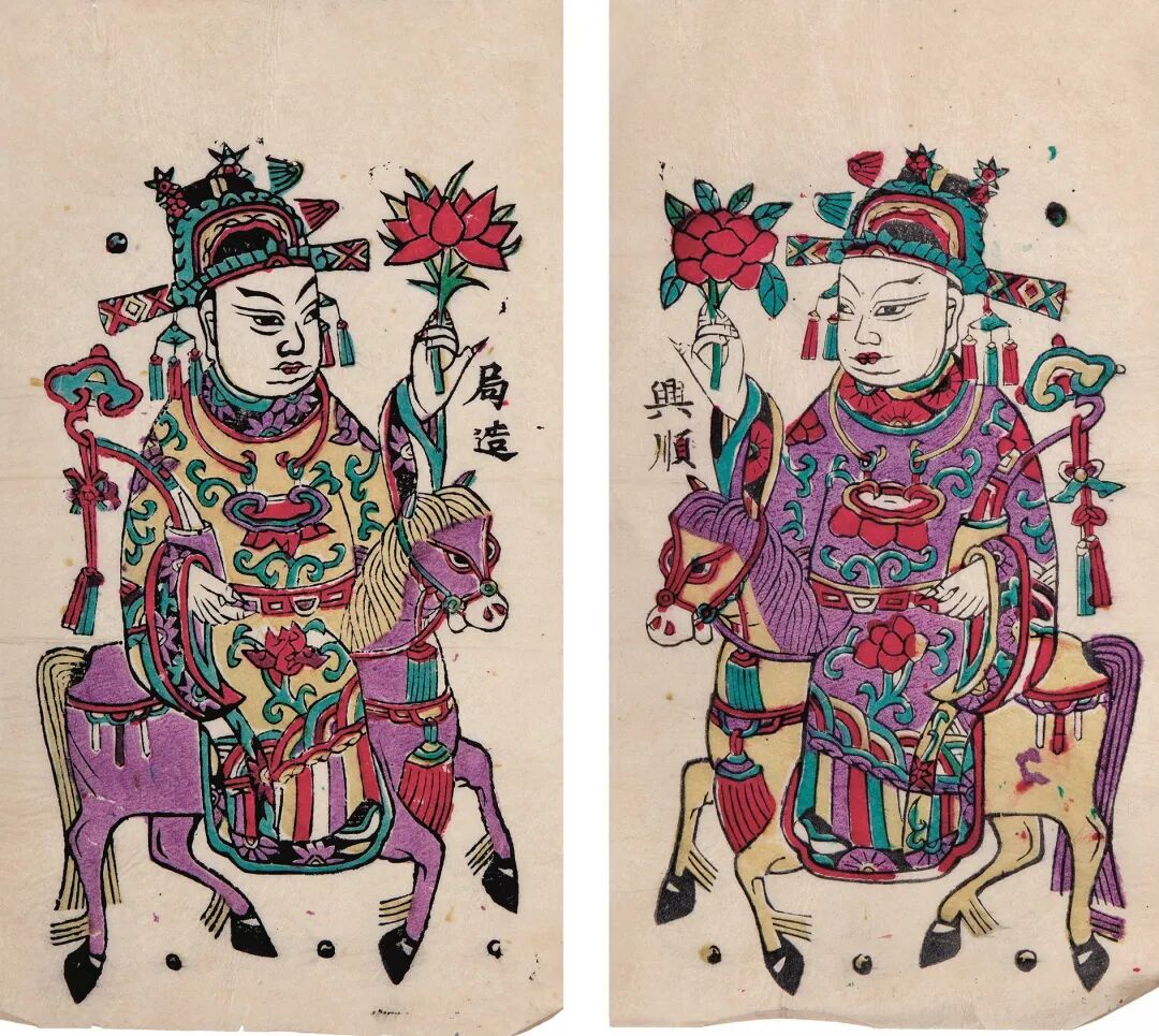有一些较为特别的门神,比如非常时期的“骑龙跨凤门神”——
