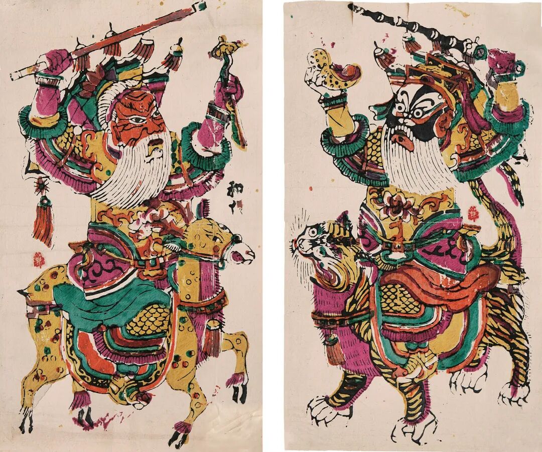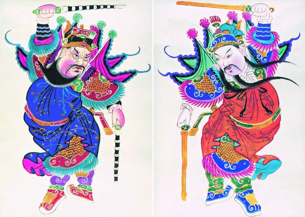 两扇门,两个门神,对称的组合,所选人物也多是旗鼓相当、一时瑜亮。民间年画喜从历史演义中选取人物,譬如《隋唐演义》中的李元霸、宇文成都,《封神演义》中的燃灯道人、赵公明,方相、方弼,《东汉演义》中的姚期、马武,《杨家将》里的孟良、焦赞,甚至是《水浒》里的武松和孙二娘……
