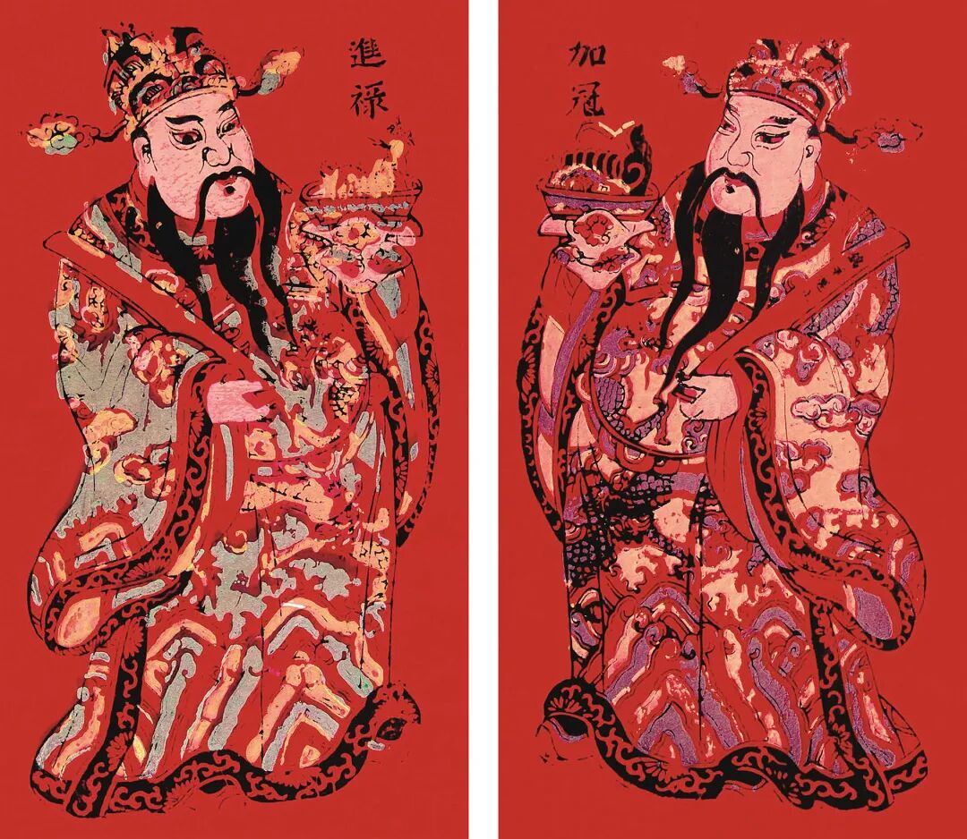 威风凛凛的武士之外,还有一些文官形象,寄托了官本位的执念,平头百姓家里,也会贴几张加官进爵的文官门神——