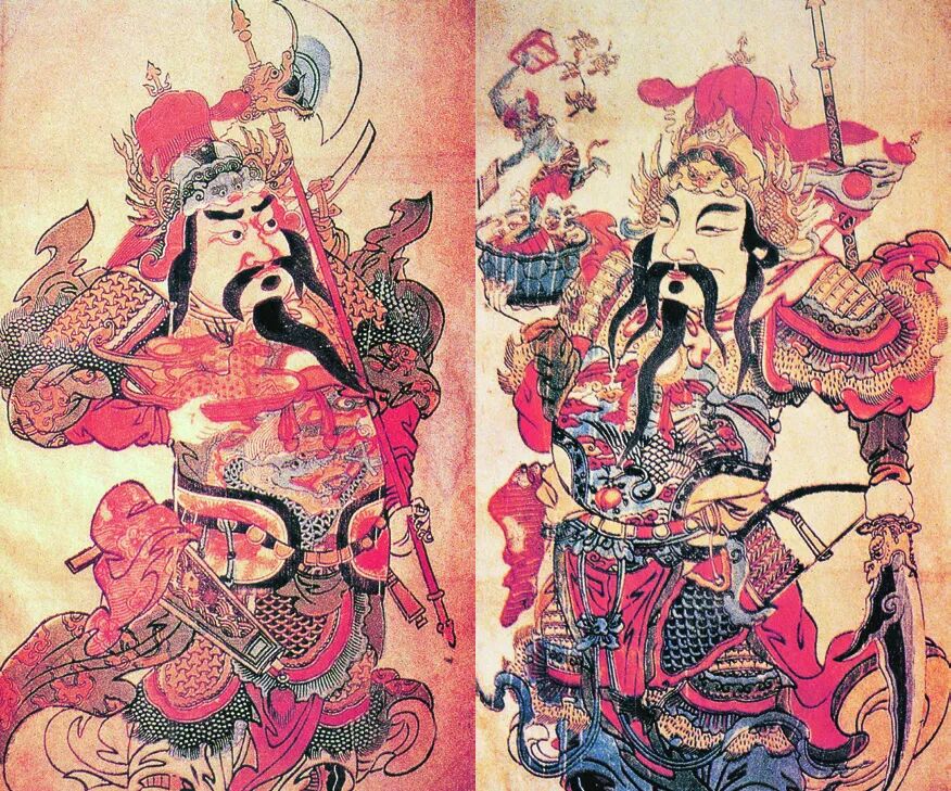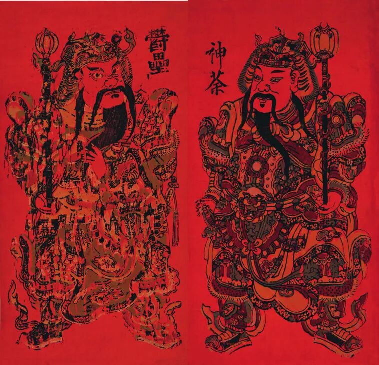 中国人的神明何其多,每日开合的门户,也有门神掌管。门神起源于何时?一个叫神荼(shēn shū),一个叫郁垒(yù lǜ),东汉王充《论衡·订鬼》引《山海经》曰:“沧海之中,有度朔之山,上有大桃木,其屈蟠三千里,其枝间东北曰鬼门,万鬼所出入也。上有二神人,一曰神荼,一曰郁垒,主阅领万鬼。善害之鬼,执以苇索而以食虎。于是黄帝乃作礼以时驱之,立大桃人,门户画神荼、郁垒与虎,悬苇索以御凶魅。”今本《山海经》并无此段文字,或为其中遗失的段落。黄帝命人在门上画鬼王神荼、郁垒二人像,当属门神的开端。